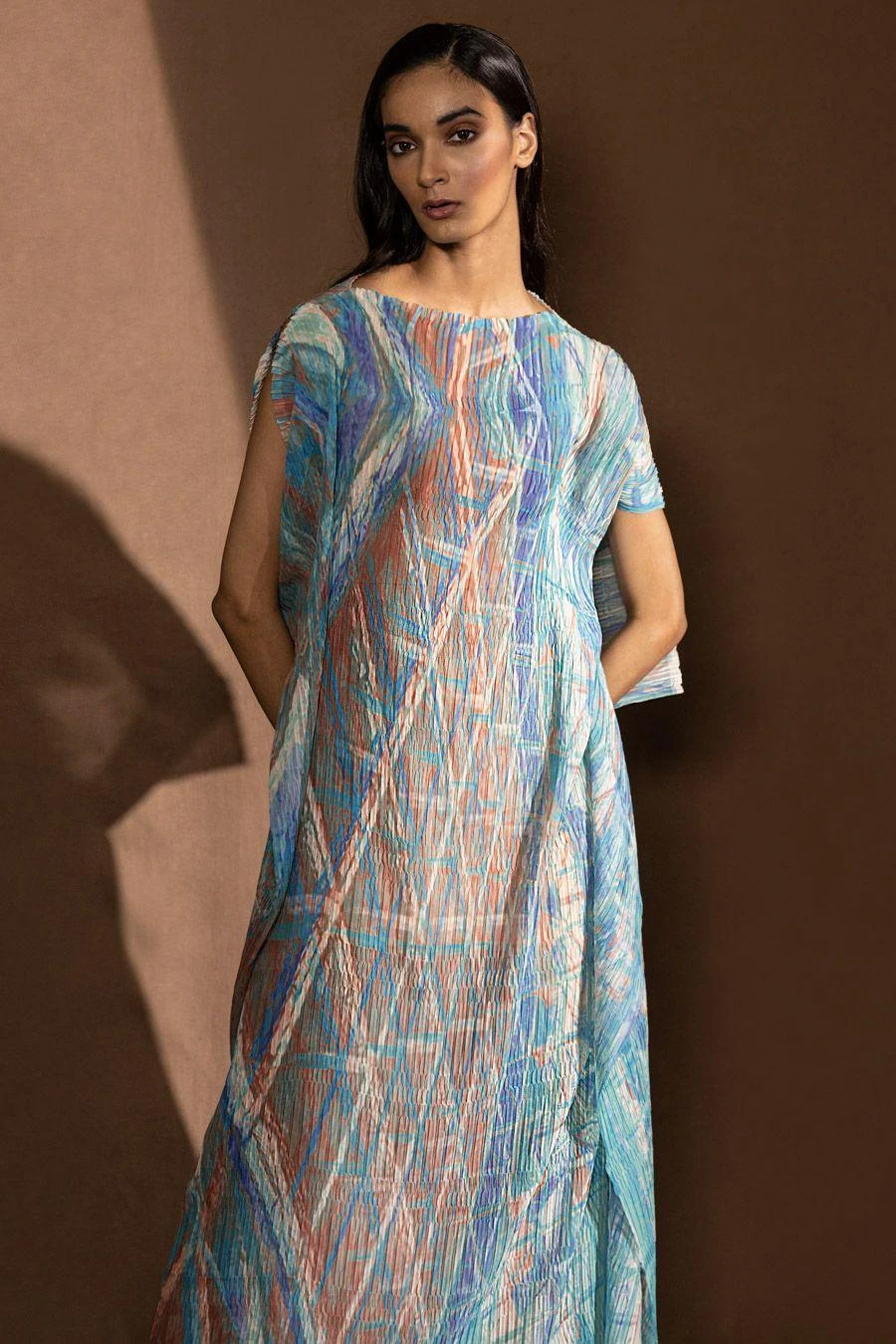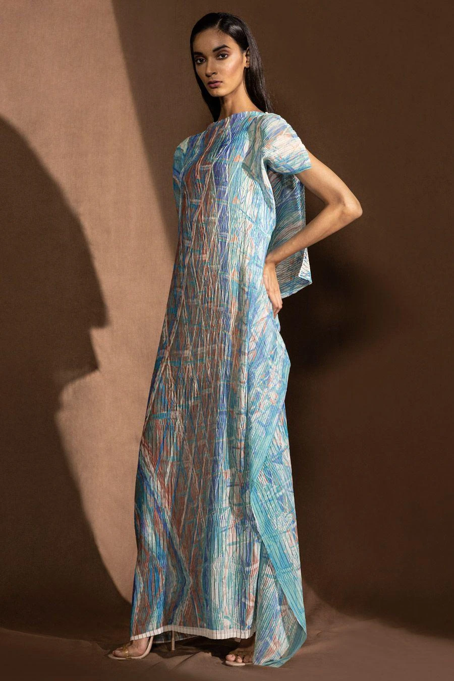 This statement dress from Abhishek Sharma’s collection is the perfect choice for an elegant fall look. Crafted in poly georgette, this asymmetric draped dress features an abstract geometric pattern all over.