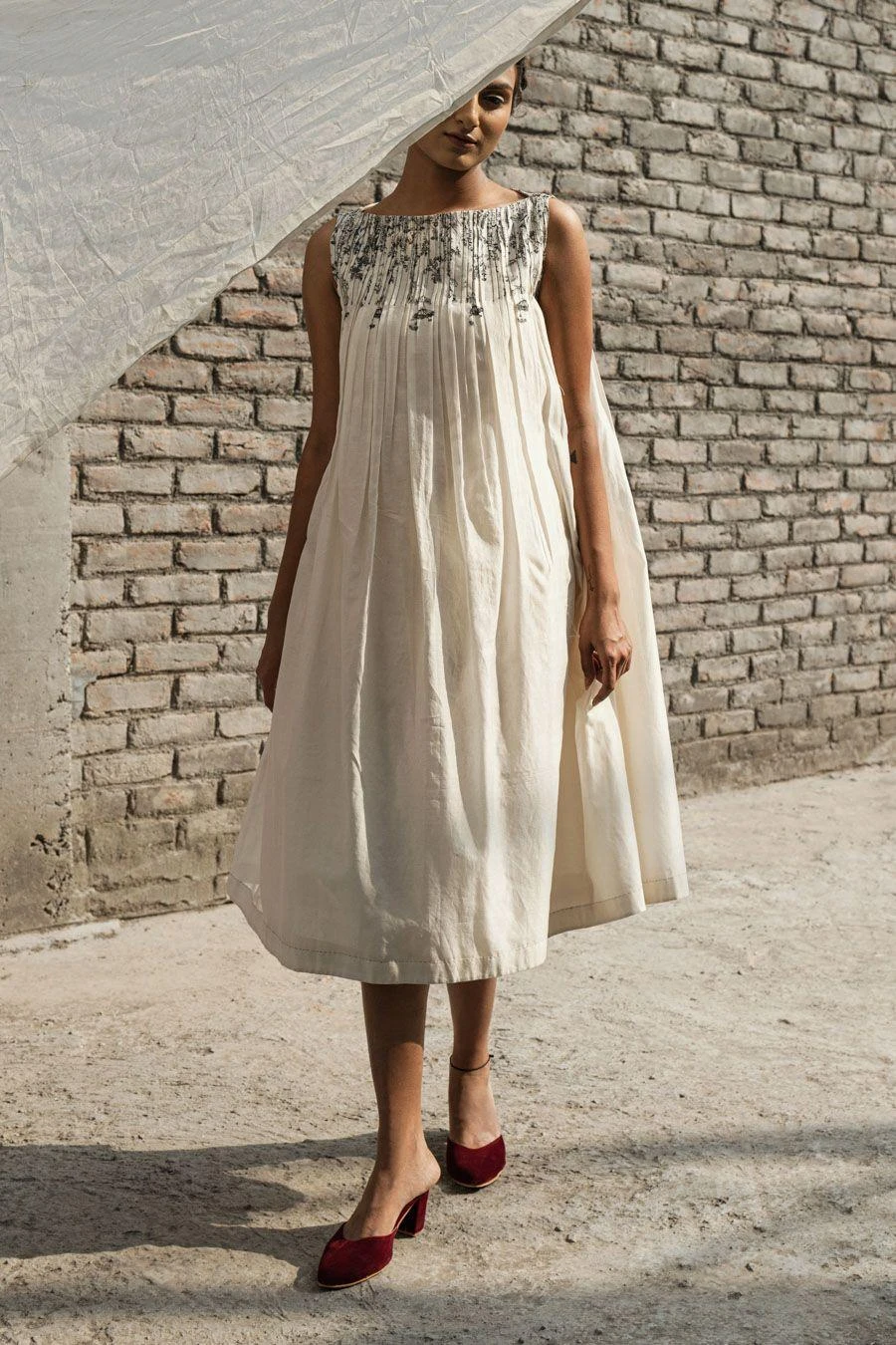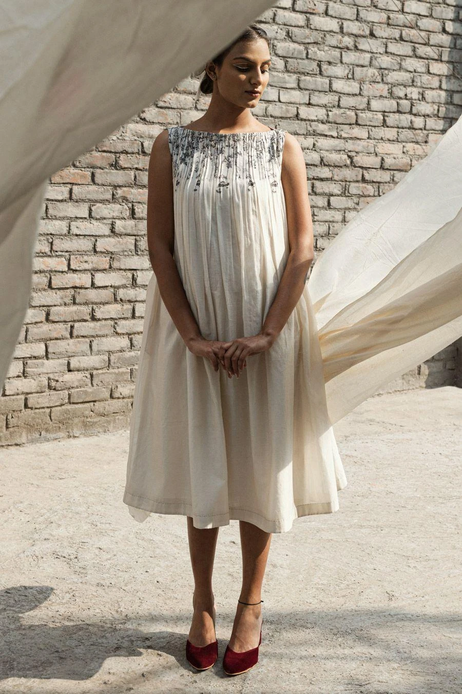 Effortlessly chic and imbued with an alluring printed shoulder and neck detail, the pleated boat neck dress is the epitome of contemporary tailoring at its finest. The soft, delicate pleats add an element of charm to the dress.