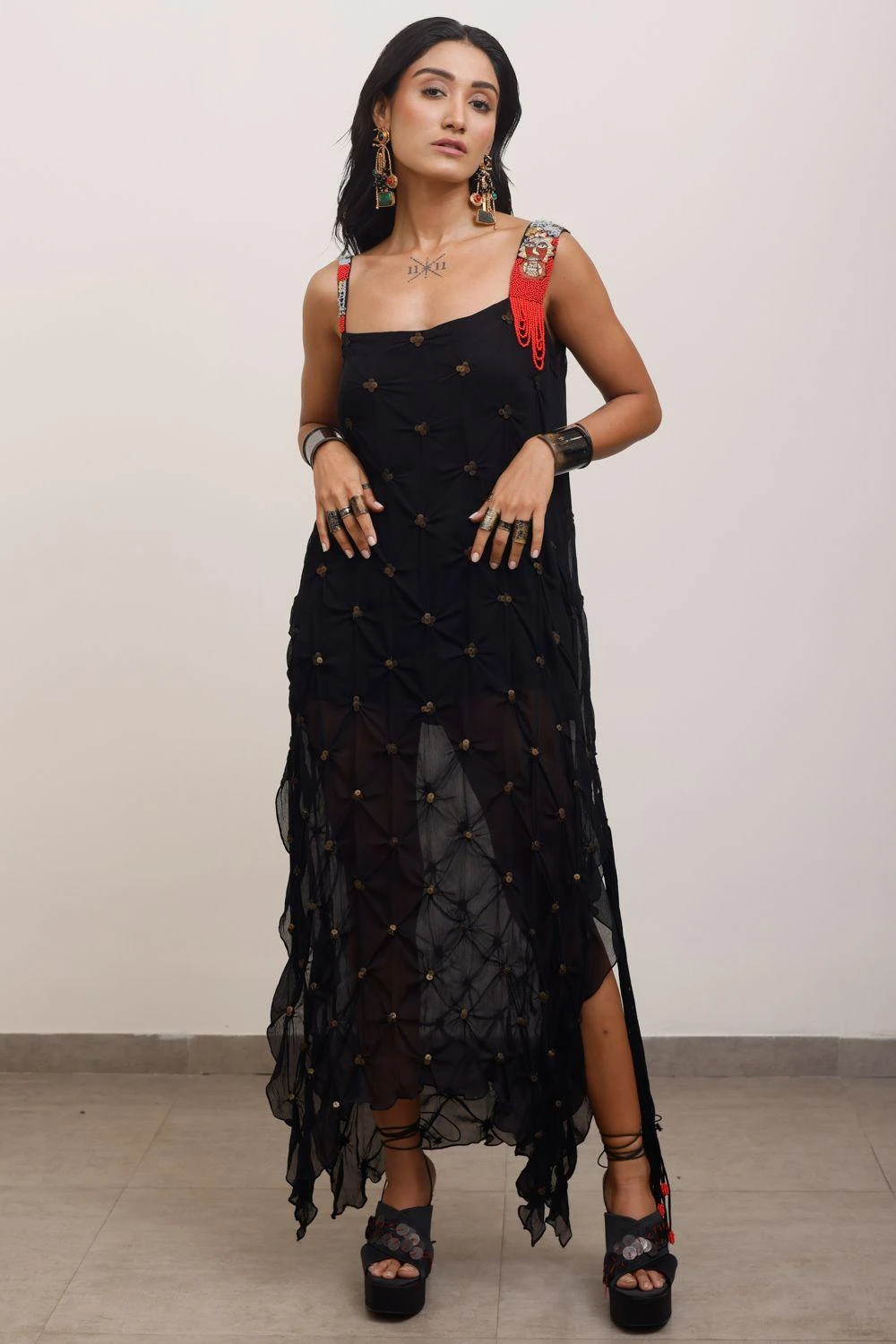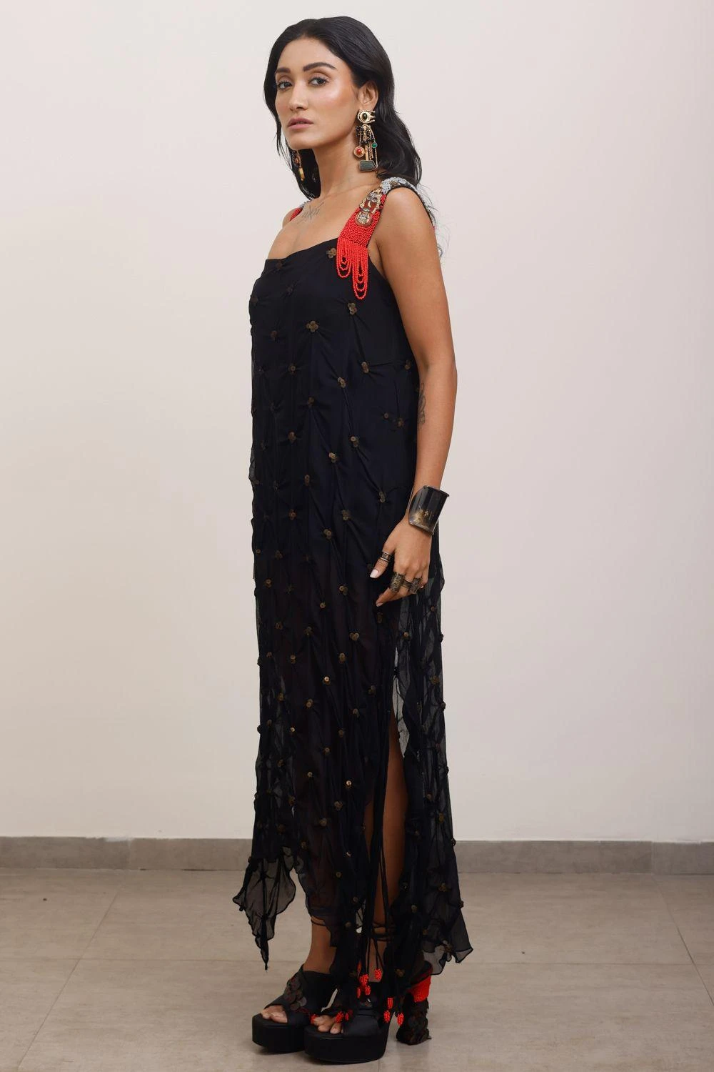 Embrace the captivating allure of this Silk Draped Dress. Crafted from luxurious silk, its fluid silhouette and exquisite draping create a sense of ethereal beauty. Meticulously designed, this dress effortlessly combines grace and sophistication.