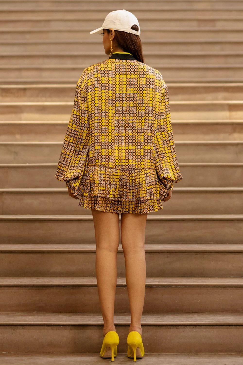 This Printed Short Dress flaunts charming art deco prints combined with sporty style. This satin dress with balloon-style sleeves creates a flowy yet powerful look.