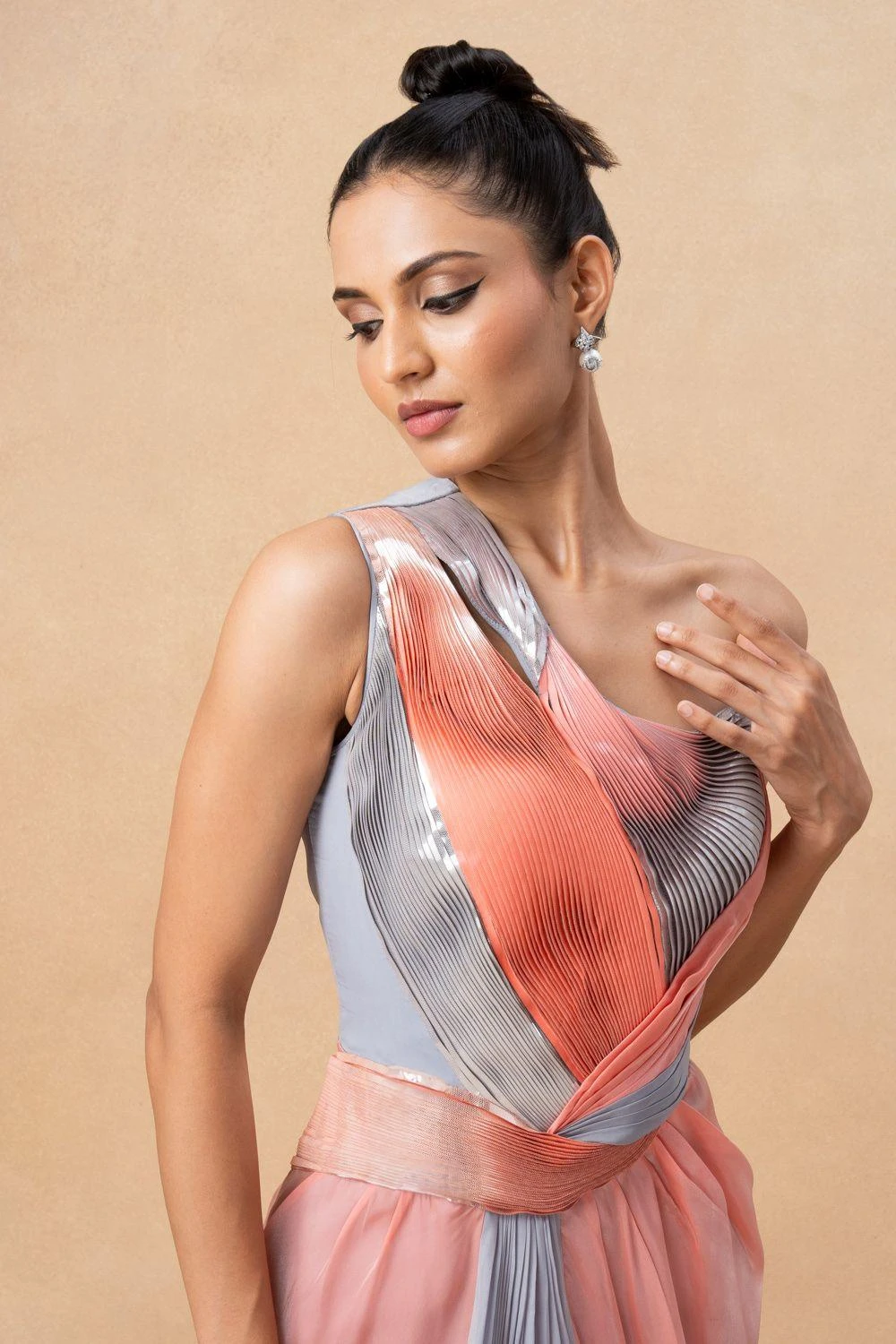Experience the epitome of modern elegance with this blush and grey draped dress. This captivating piece effortlessly combines soft hues and graceful draping for a timeless look. Embrace its understated beauty & exude sophistication at every occasion.