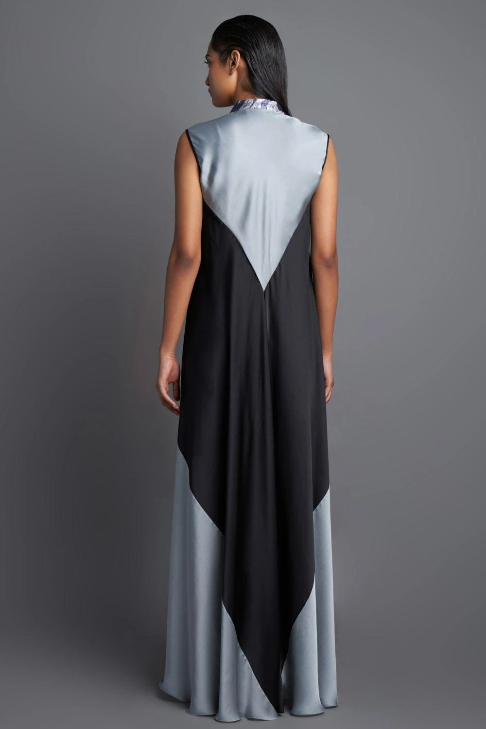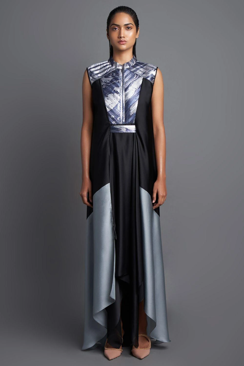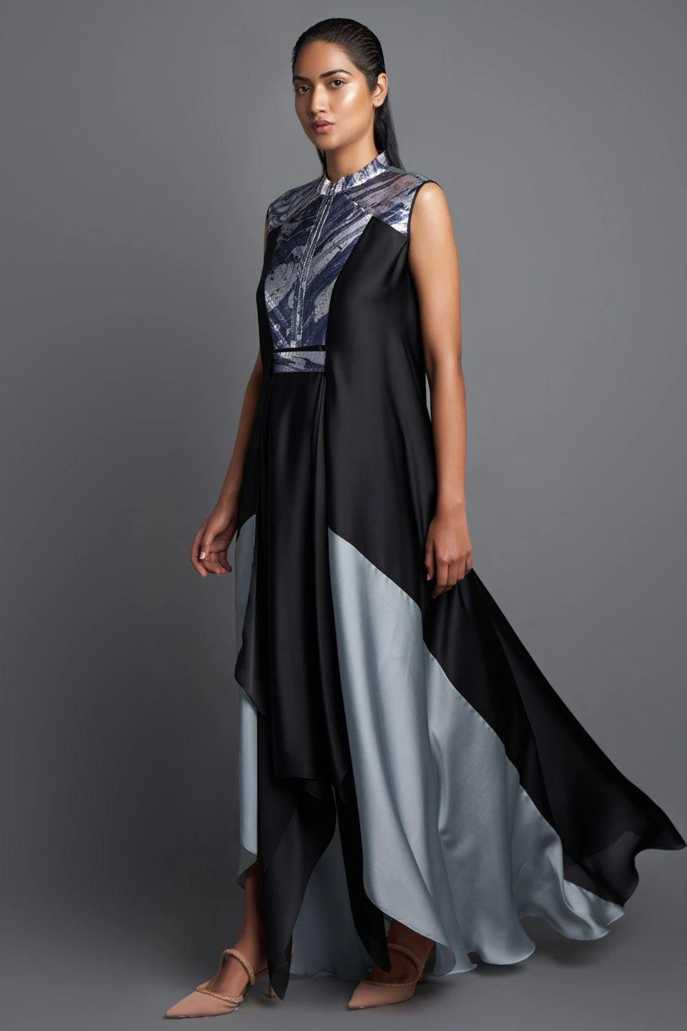An elegant silhouette and opulent tones make it a great choice for your next evening soiree. This black panelled dress is cut in flowy chiffon and features a handwoven metallic polymer marbled yoke and a belt.