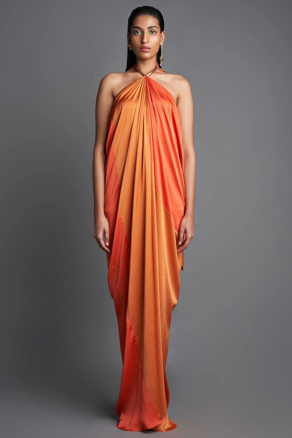 This panelled draped halter dress is fun & flirty, just what you need for dressy summer affairs. It is cut in fluid fabric with metal pipe neckline & handkerchief hem. You can style it with a pair of statement danglers and a clutch.
