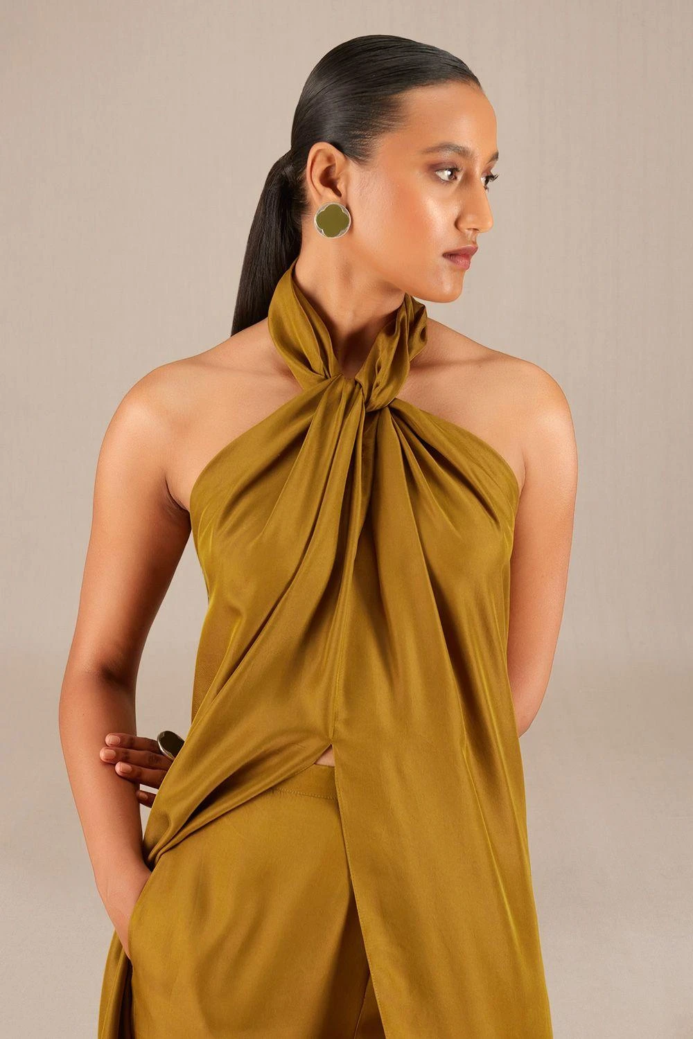 Crafted in soft luxurious silk, Ezra showcases chic camel hues in a flowing relaxed dress-top pant silhouette. Ideal for delightful date nights, this set includes complementary pants for added versatility and comfort.