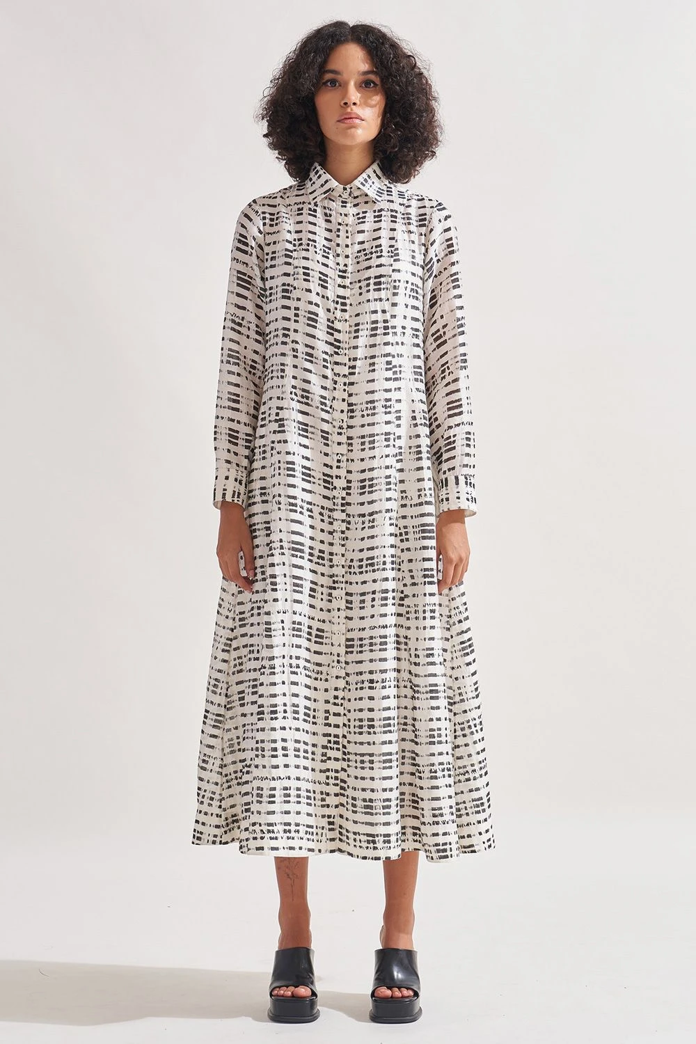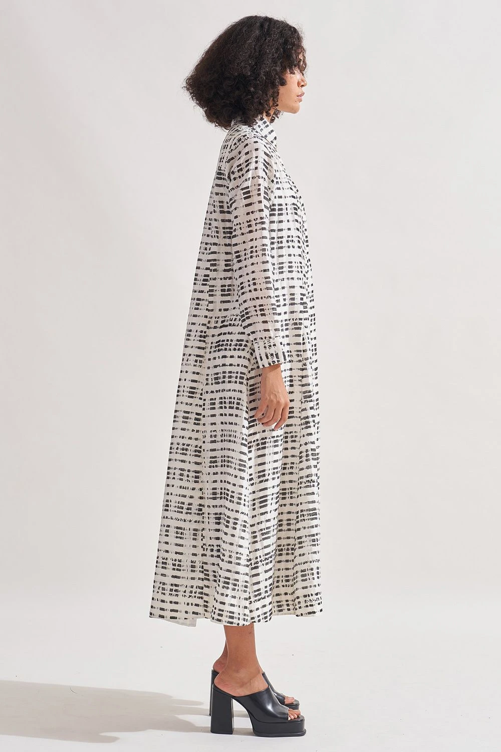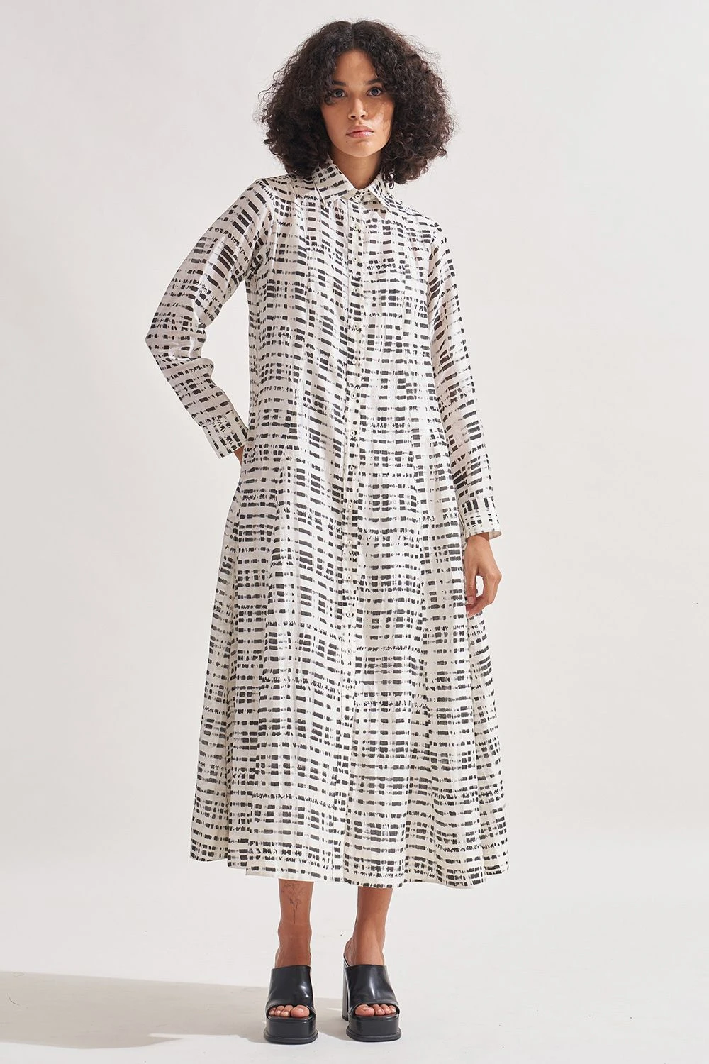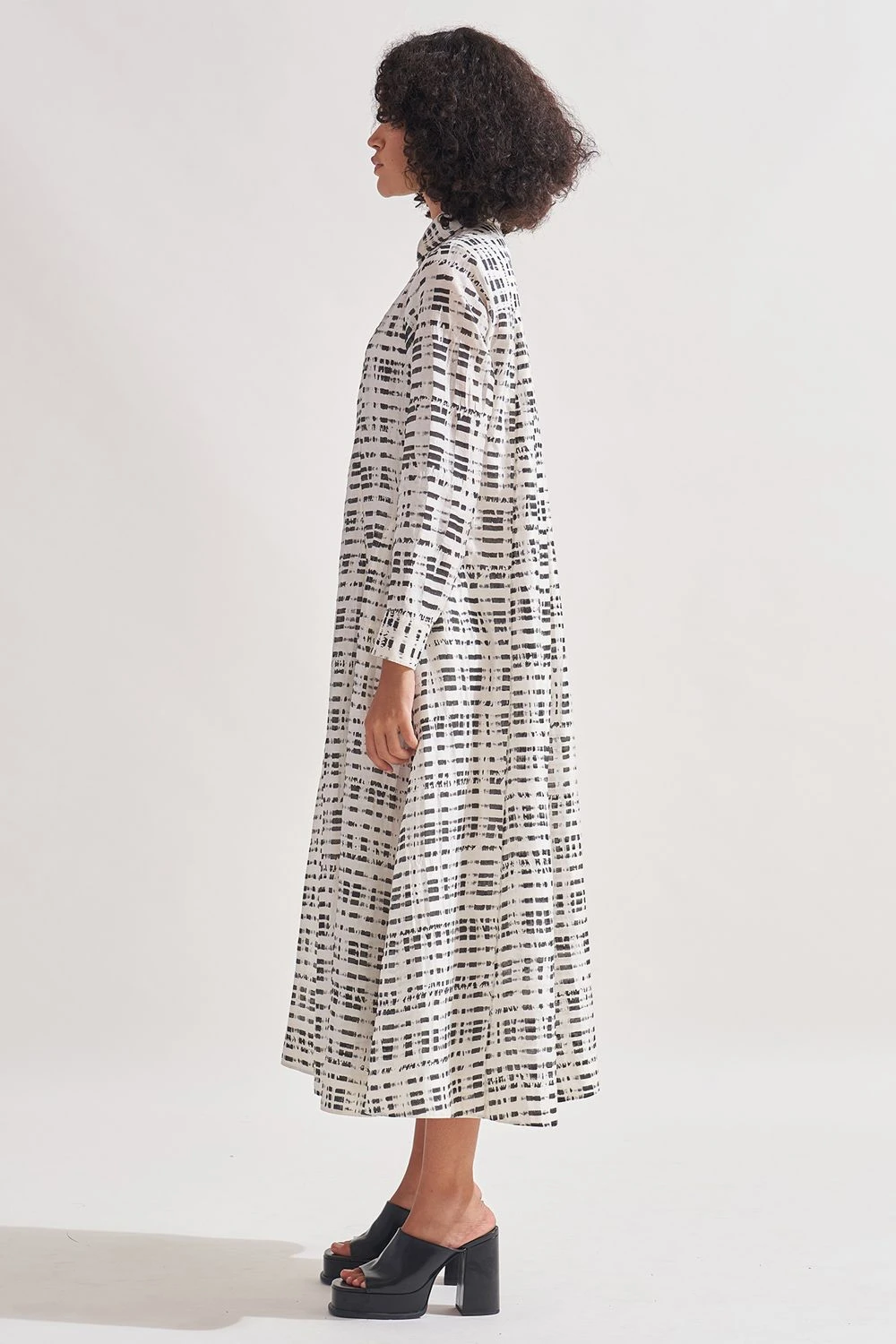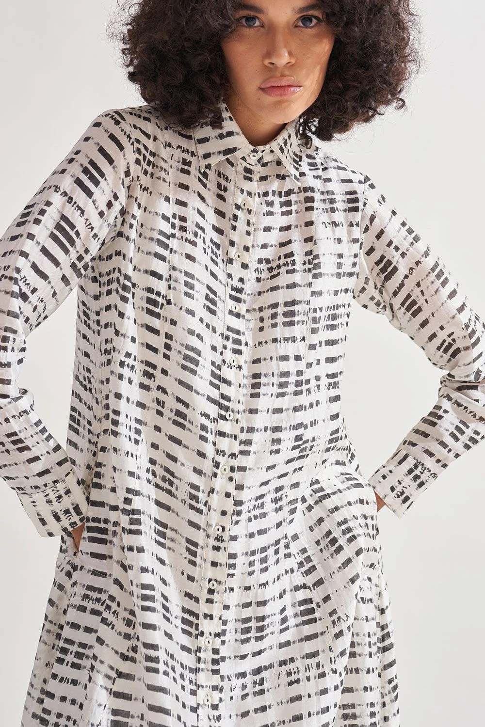 Indulge in the allure of this hi-lo panelled dress. Adorned with exquisite hand-block print patterning, this dress is a true work of art. The collared neck adds a touch of sophistication, while the full sleeves with cuffs bring a sense of elegance.
