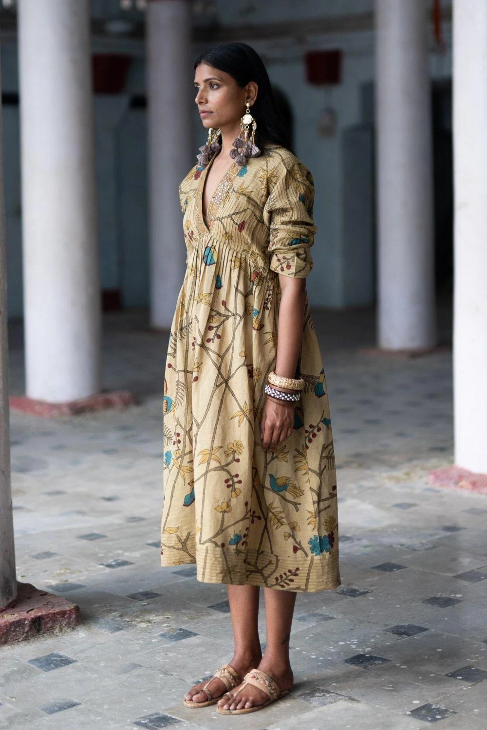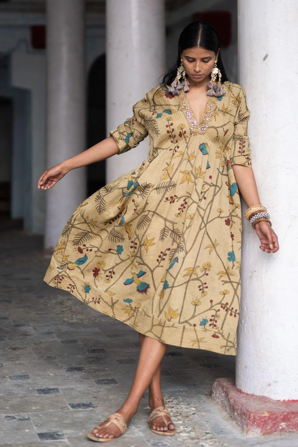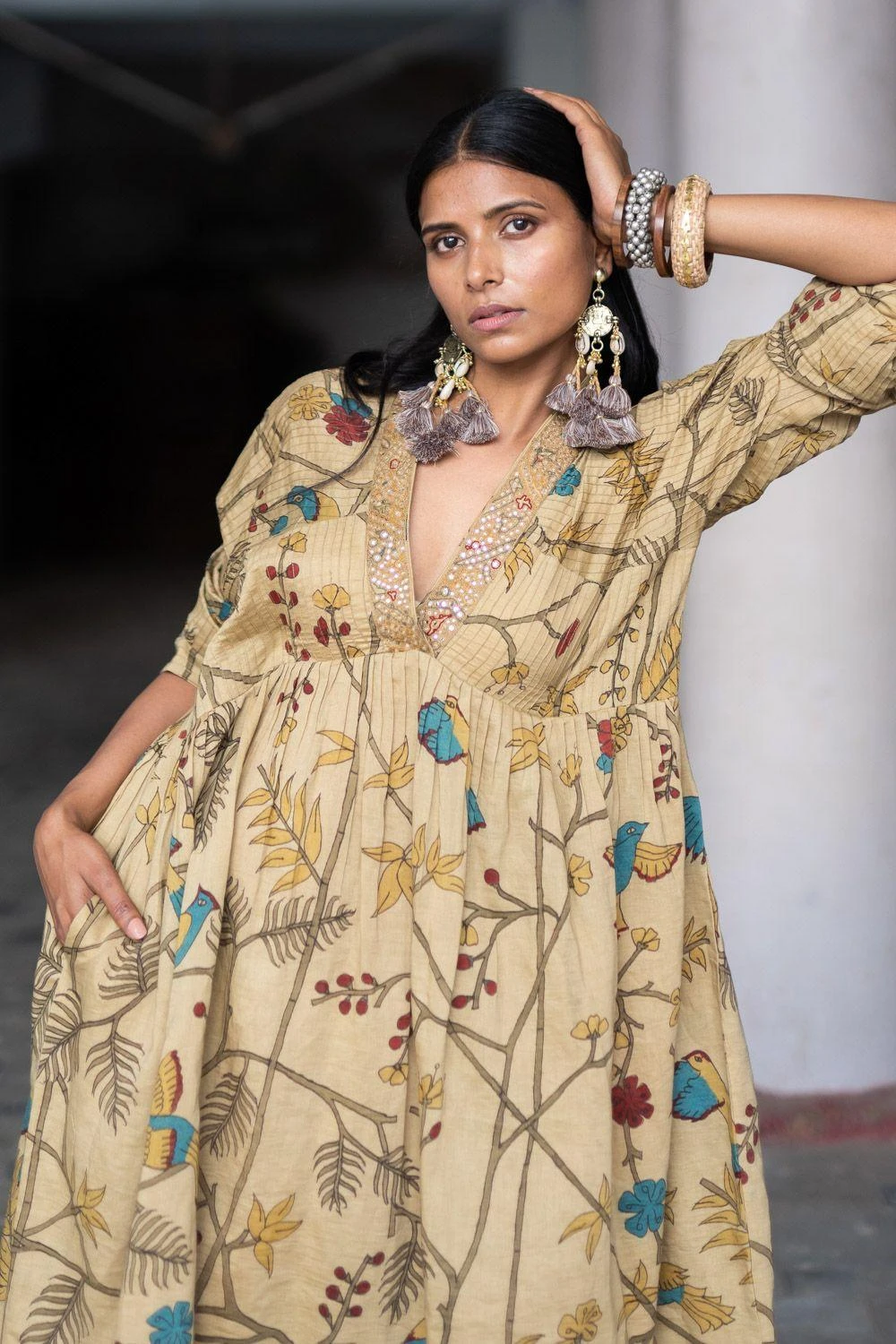 This beige chanderi dress is set in a flattering silhouette with beautiful kalamkari art all over it. It is cut in a significant V neck with gathered details down the yoke. Style it with danglers for a chic look.
