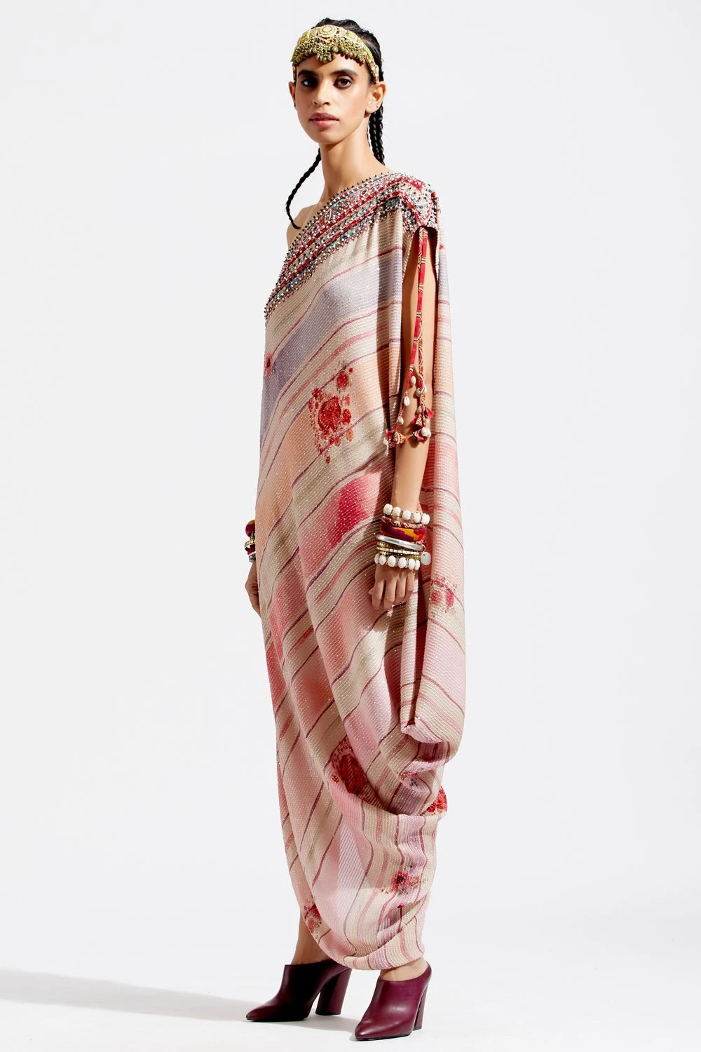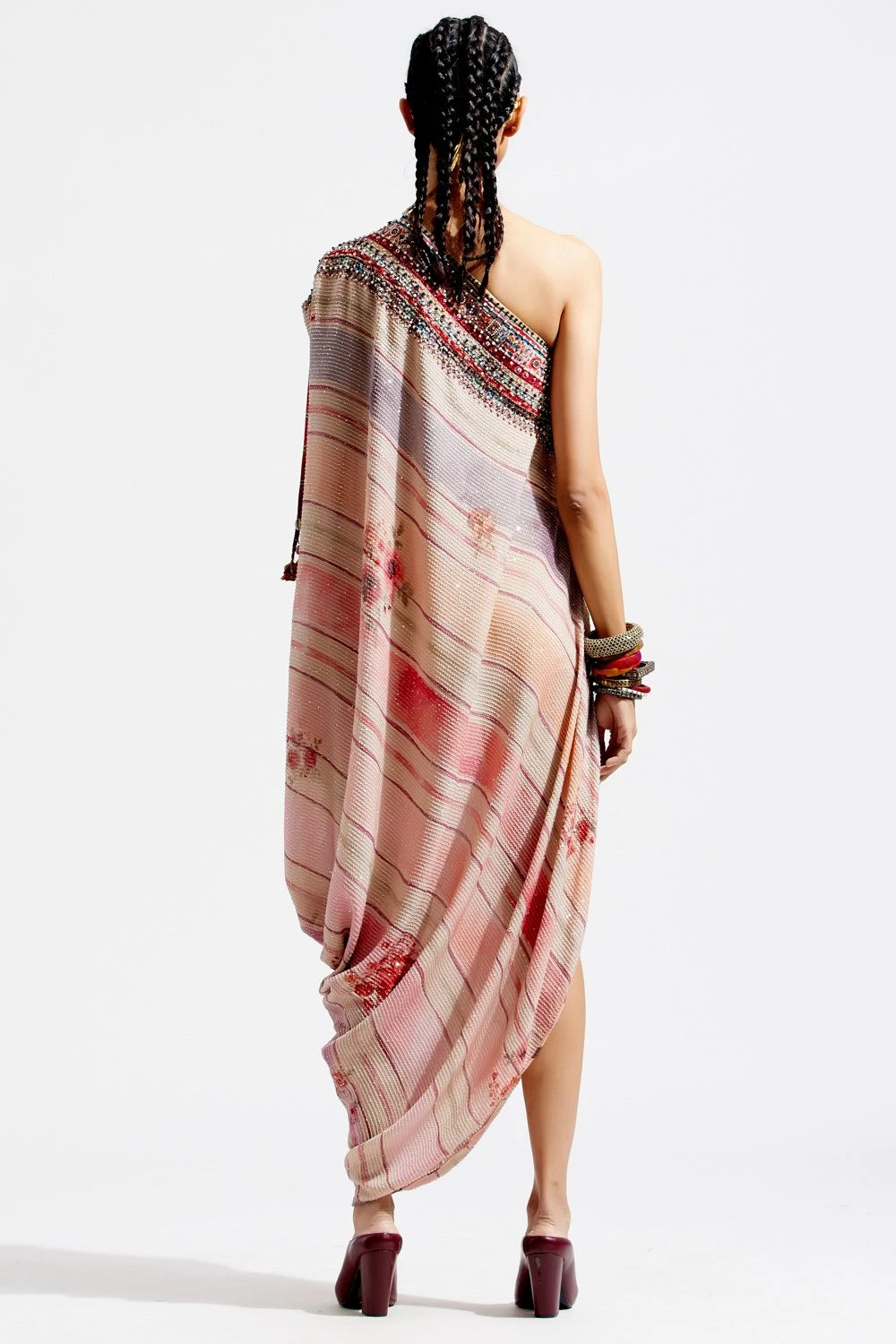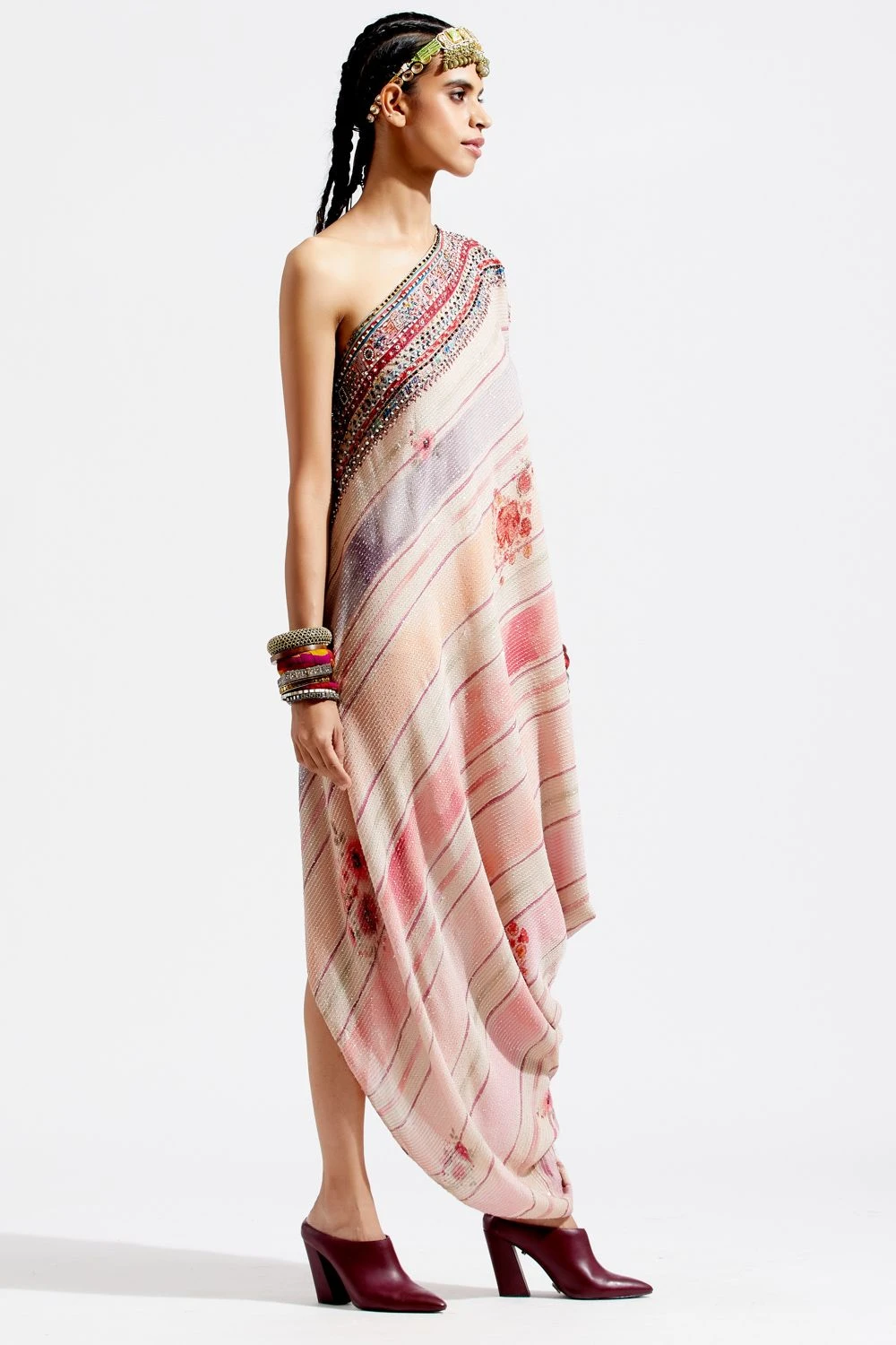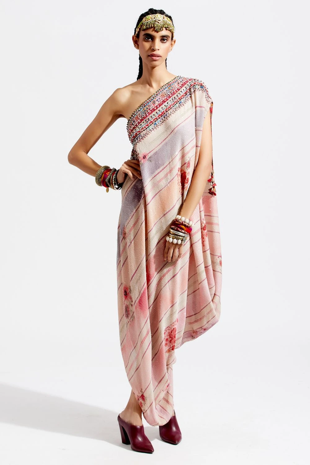 Elegant yet chic, this one shoulder rasa drape dress is a great pick for an intimate festivity. It is made in a sheeted natural crepe fabric and accented with cowry shell & tassels. Add a stack of statement cuffs and clutch to this look.
