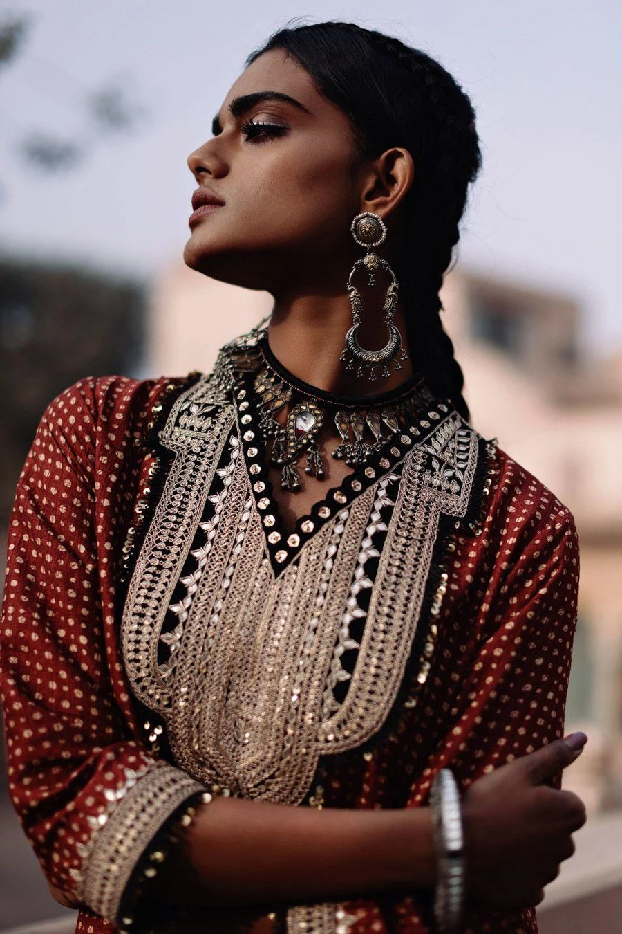 The perfect amalgamation of style & comfort, this dress works across occasions. This handblock printed dress cut in handloom raw silk, features hand done dori & gota work with sequence trims. Add a pair of dangler earrings to complete the look