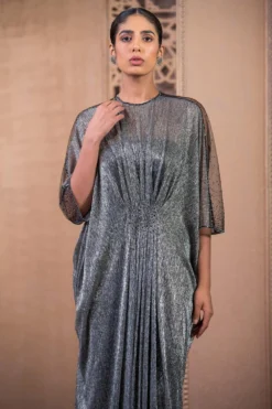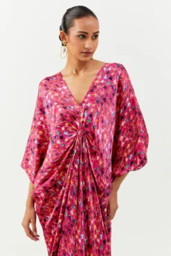 Look effortlessly stylish with this kaftan dress. Crafted in georgette, this asymmetric kaftan features a V-neckline adorned with delicate organza scalloping and intricate sequin embroidery. It is offset with a coordinating slip.