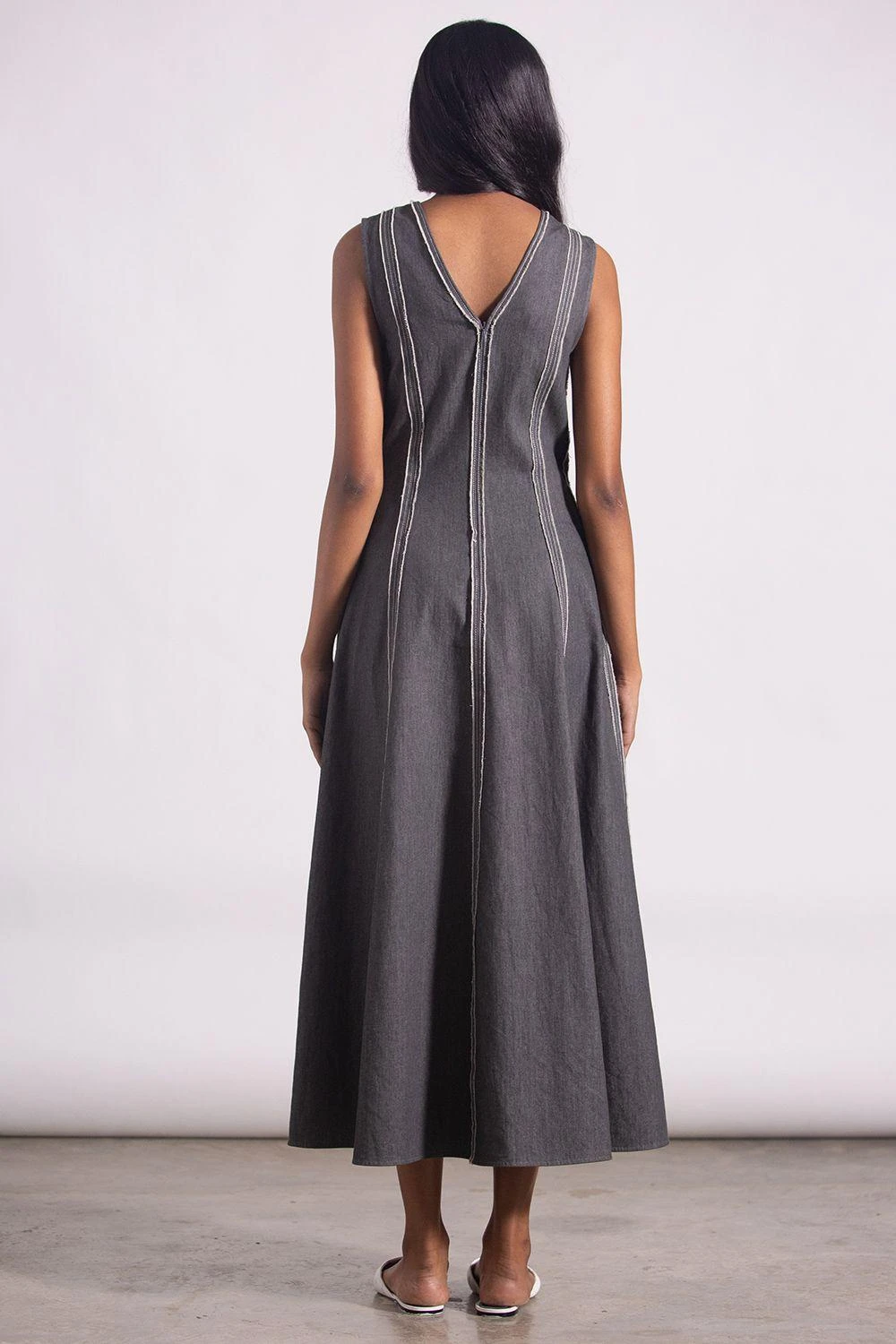 This fit-and-flare V neck dress in cotton denim is unique in its construction. Look for the raw edge detailing! Wear it with white sneakers for a brunch with your girls.