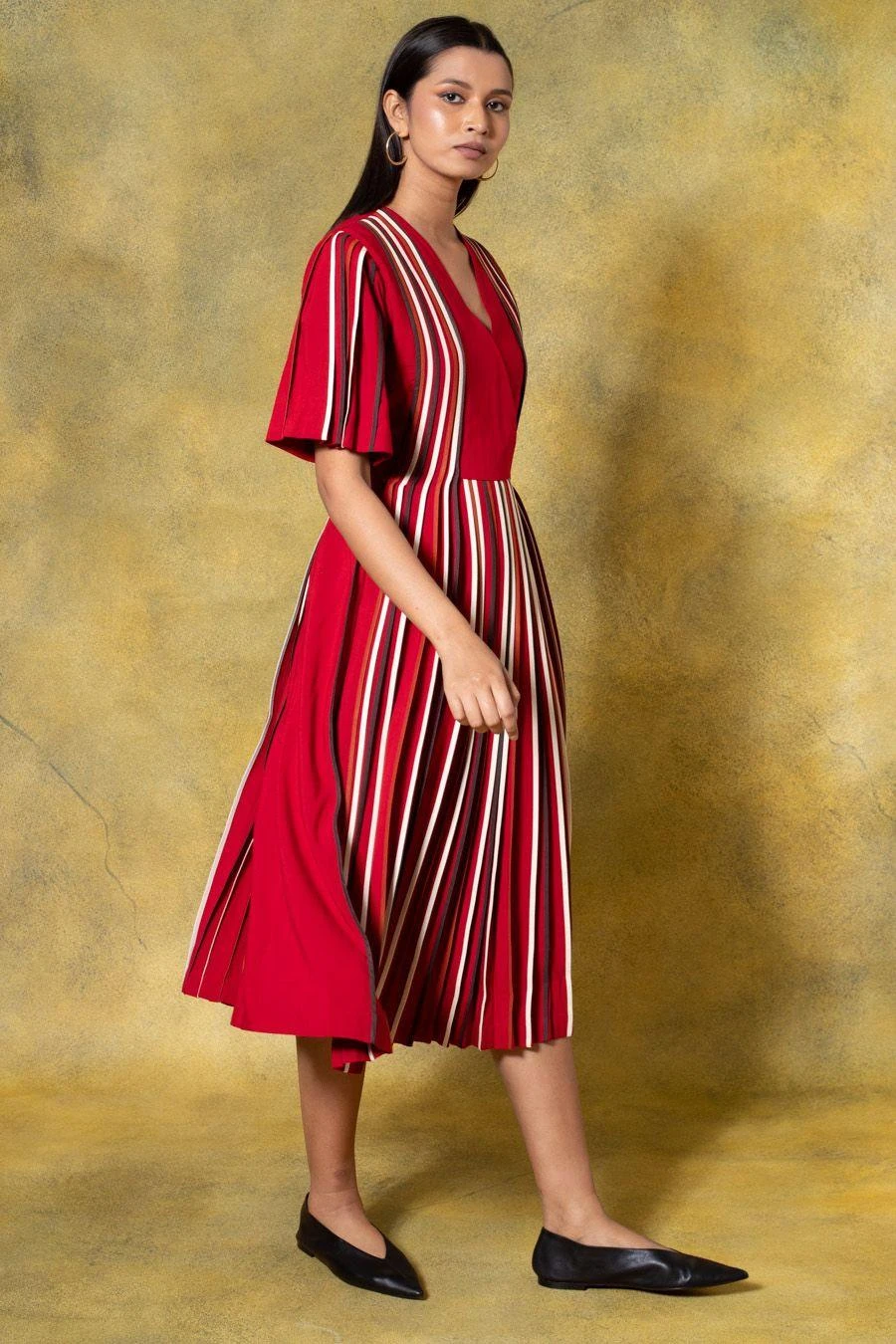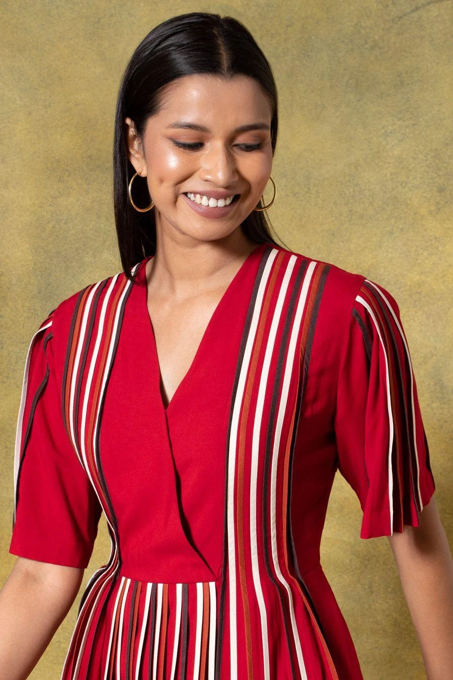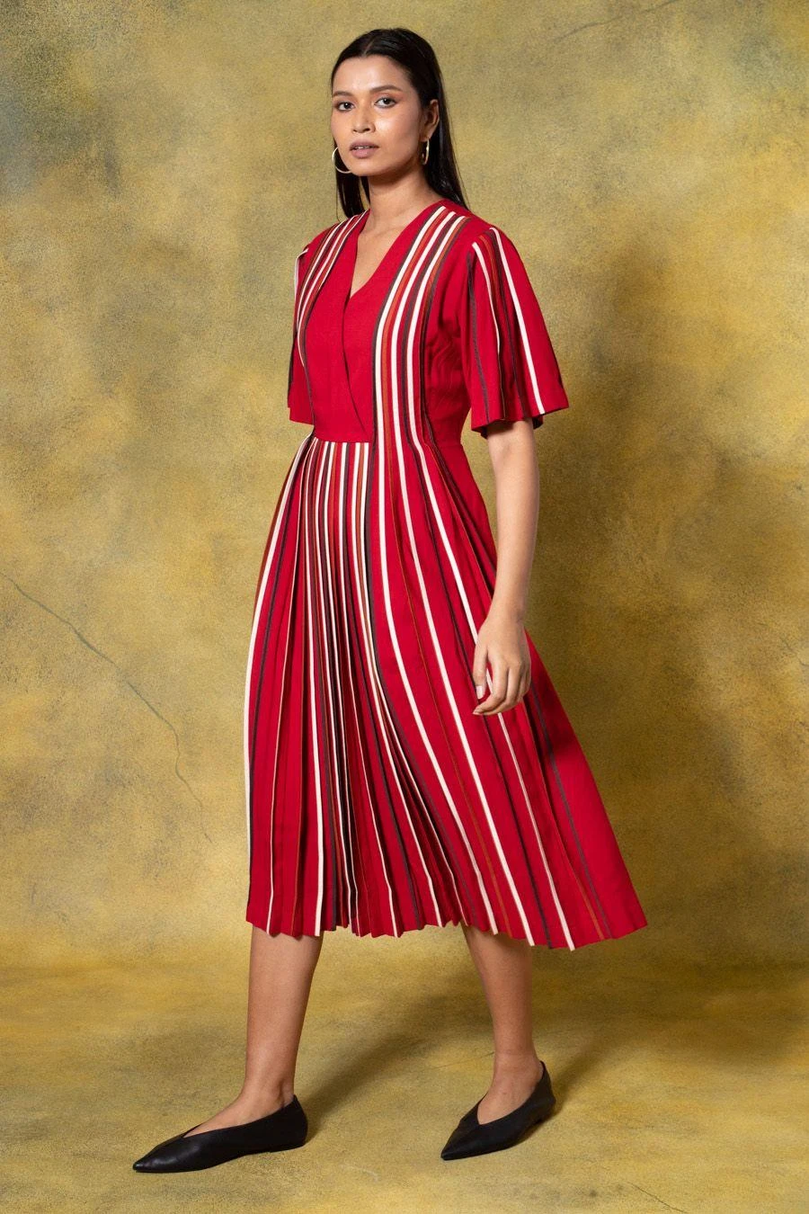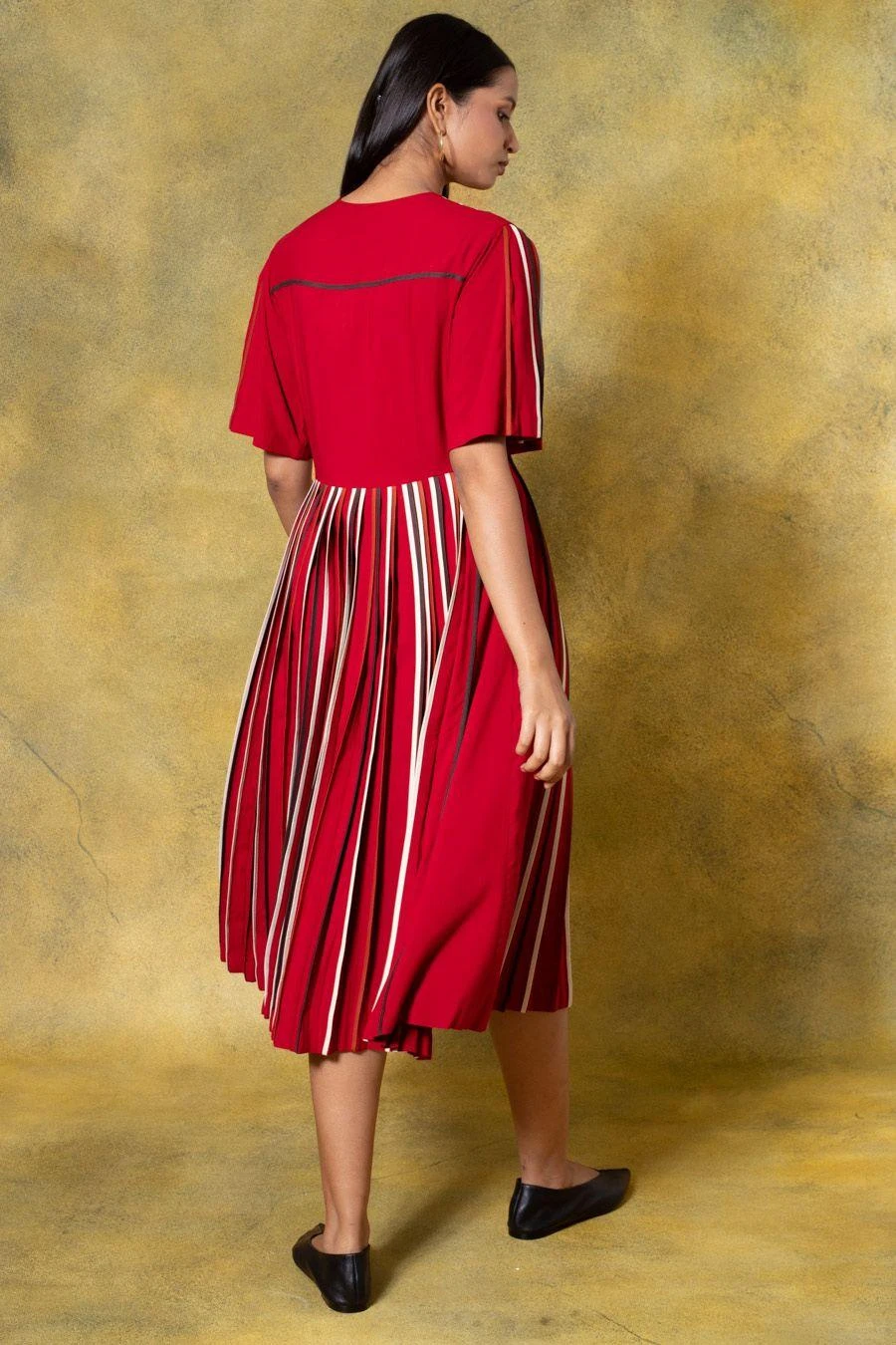 Look sartorially savvy with this red dress. Meticulously fashioned from eco-friendly kora material, this dress showcases a stunning design of intricate pleats, hand-bound with finesse, and adorned with voluminous, puffy sleeves.