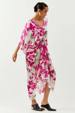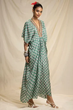 The perfect amalgamation of style & comfort, this dress is perfect for a day out. Cut in habutai silk, this pleated kaftan dress in tie and dye fetaures embroidered block & cuffs. Style this dress with a stack of bracelets to complete the look.