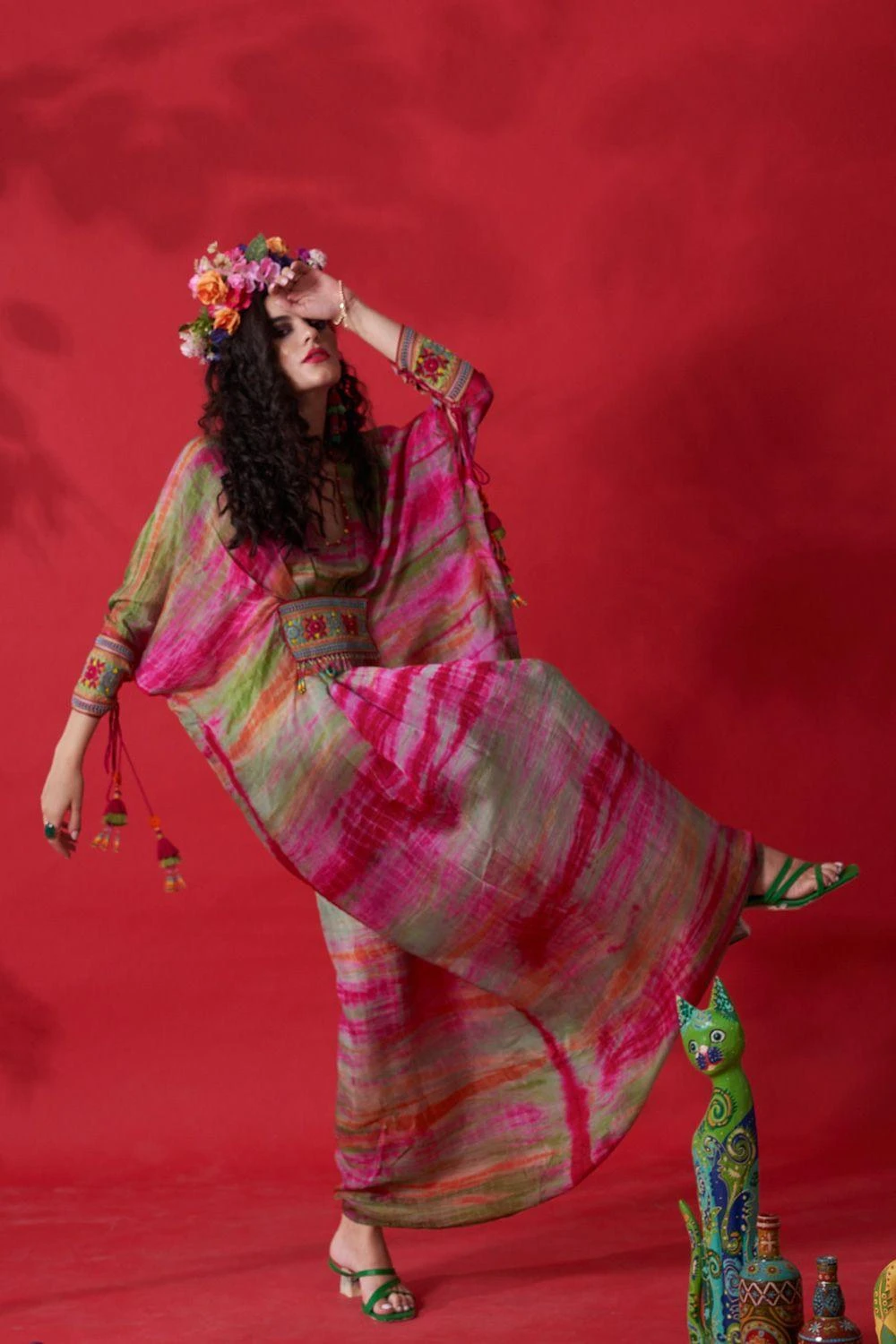 The perfect amalgamation of style & comfort, this dress is perfect for a day out. Cut in habutai silk, this pleated kaftan dress in tie and dye fetaures embroidered block & cuffs. Style this dress with a stack of bracelets to complete the look.