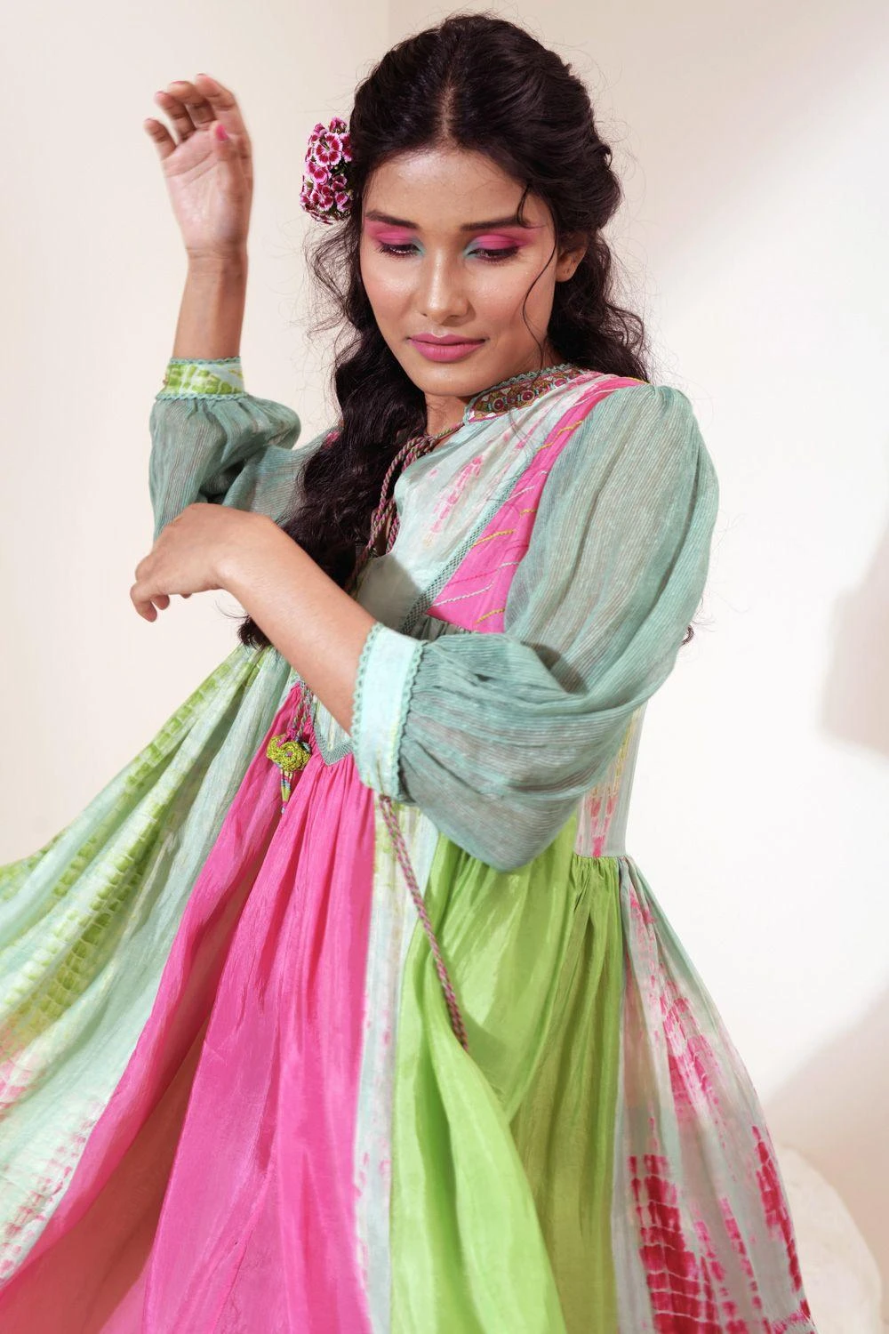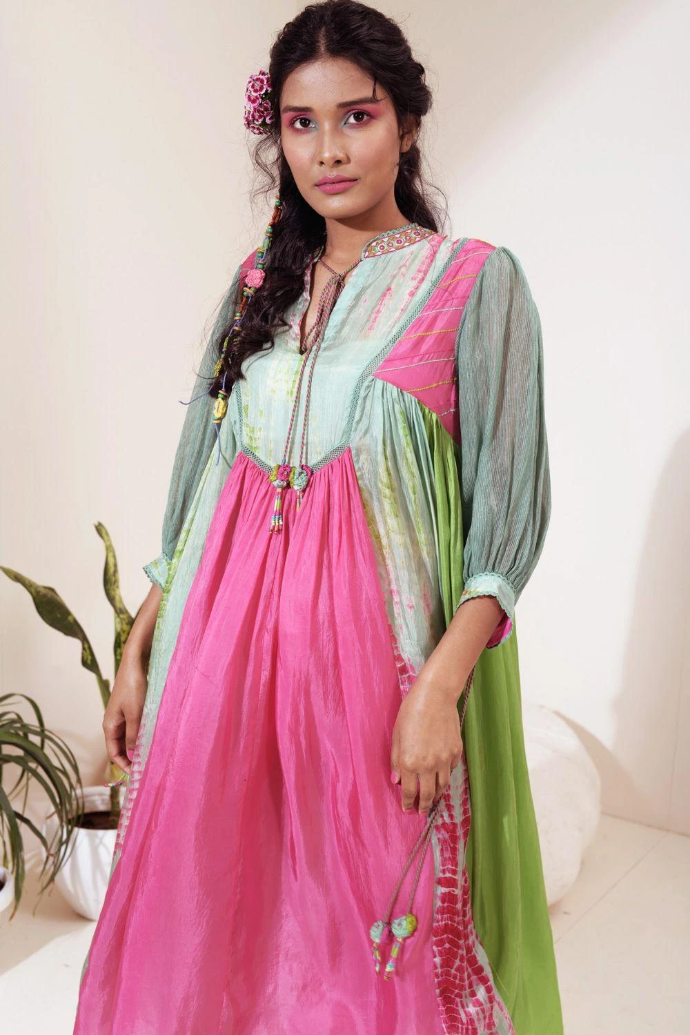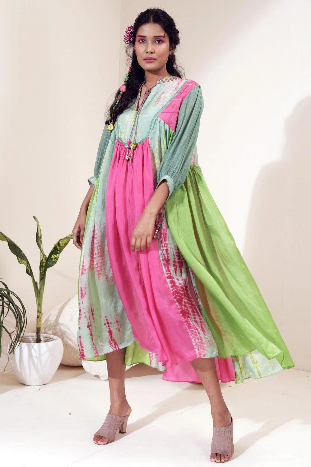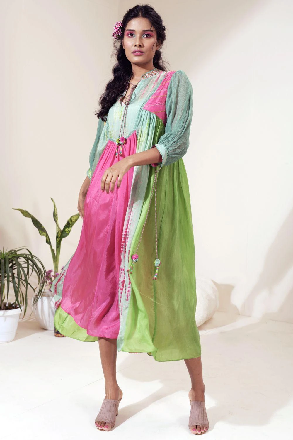 Amp up your summer closet with this easy breezy multi-coloured dress. It is cut in habutai silk in a panelled flare silhouette and features embroidered band collar and jute sleeves.