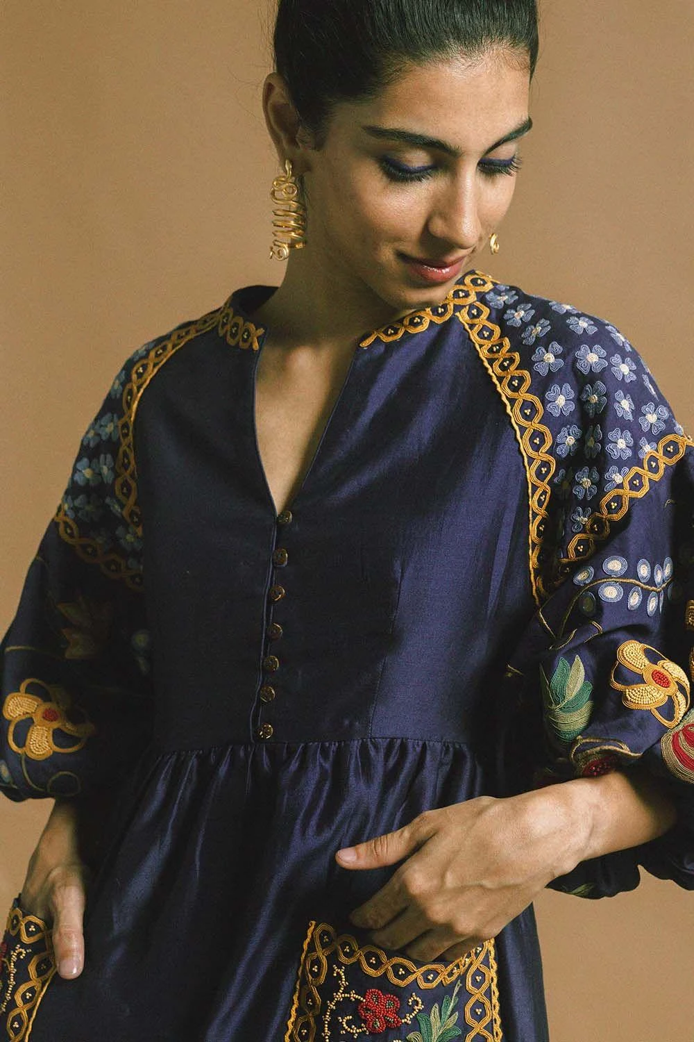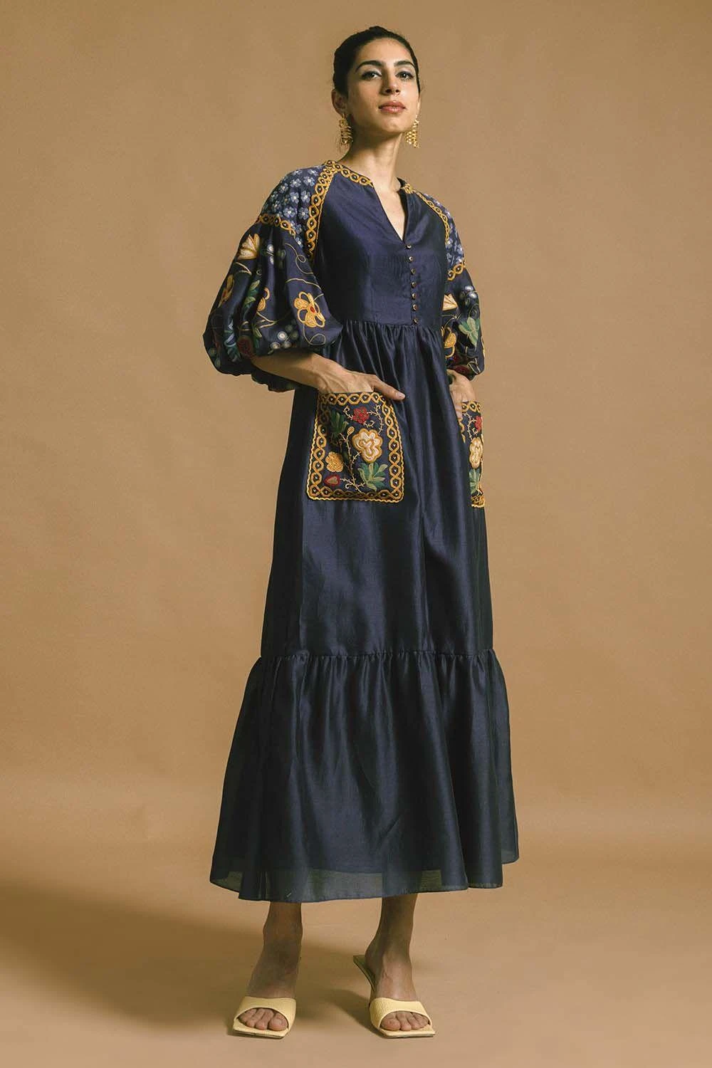 A gorgeous blue kala cotton dress with threadwork pocket detailing and coordinating embroidery on the puff sleeves, adding an element to the tiered midi dress. Wear it to an intimate dinner or pre-wedding function depending on how you style it.