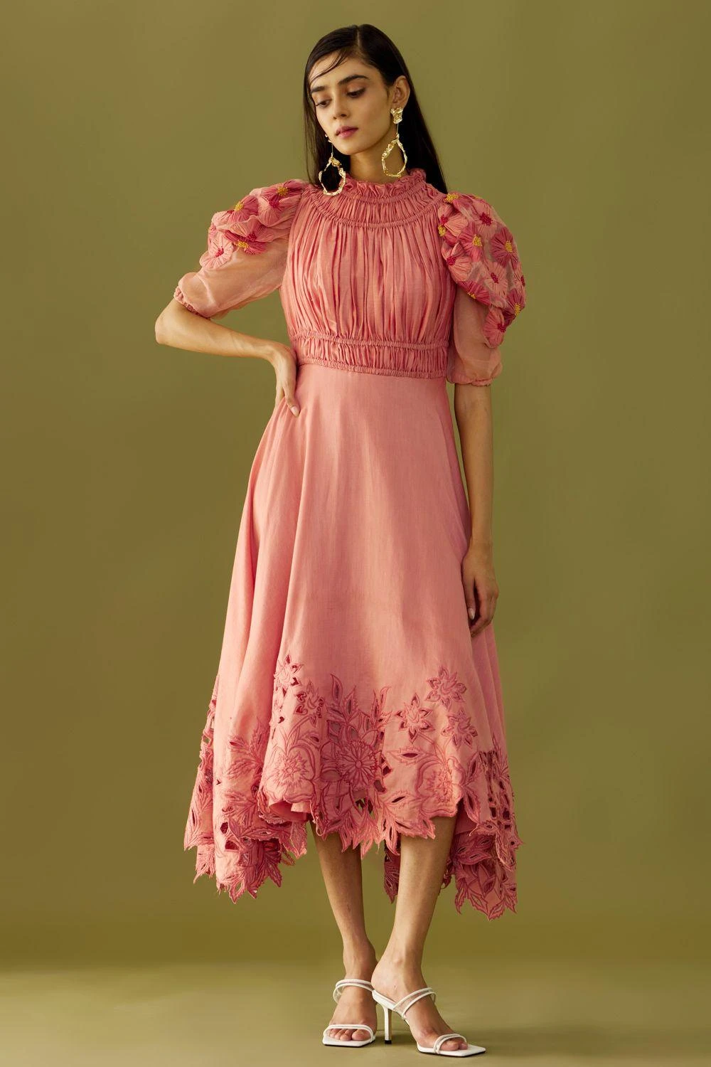 Maximise the life of your wardrobe with this exquisite ruched dress. Cut in cotton, it features a floral cutwork detail on the sleeves. Style this chic dress with a stack of bracelets to complete the look.