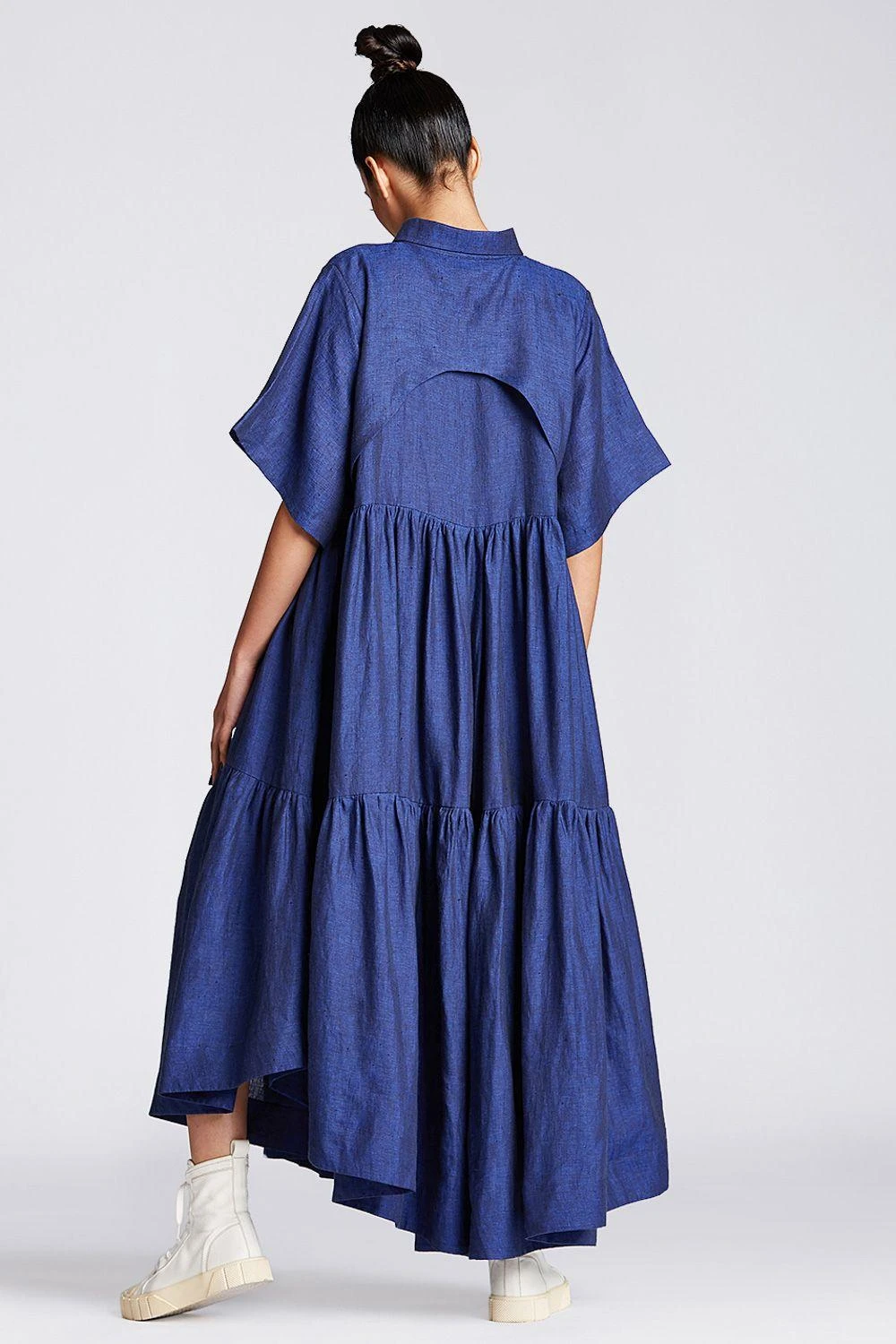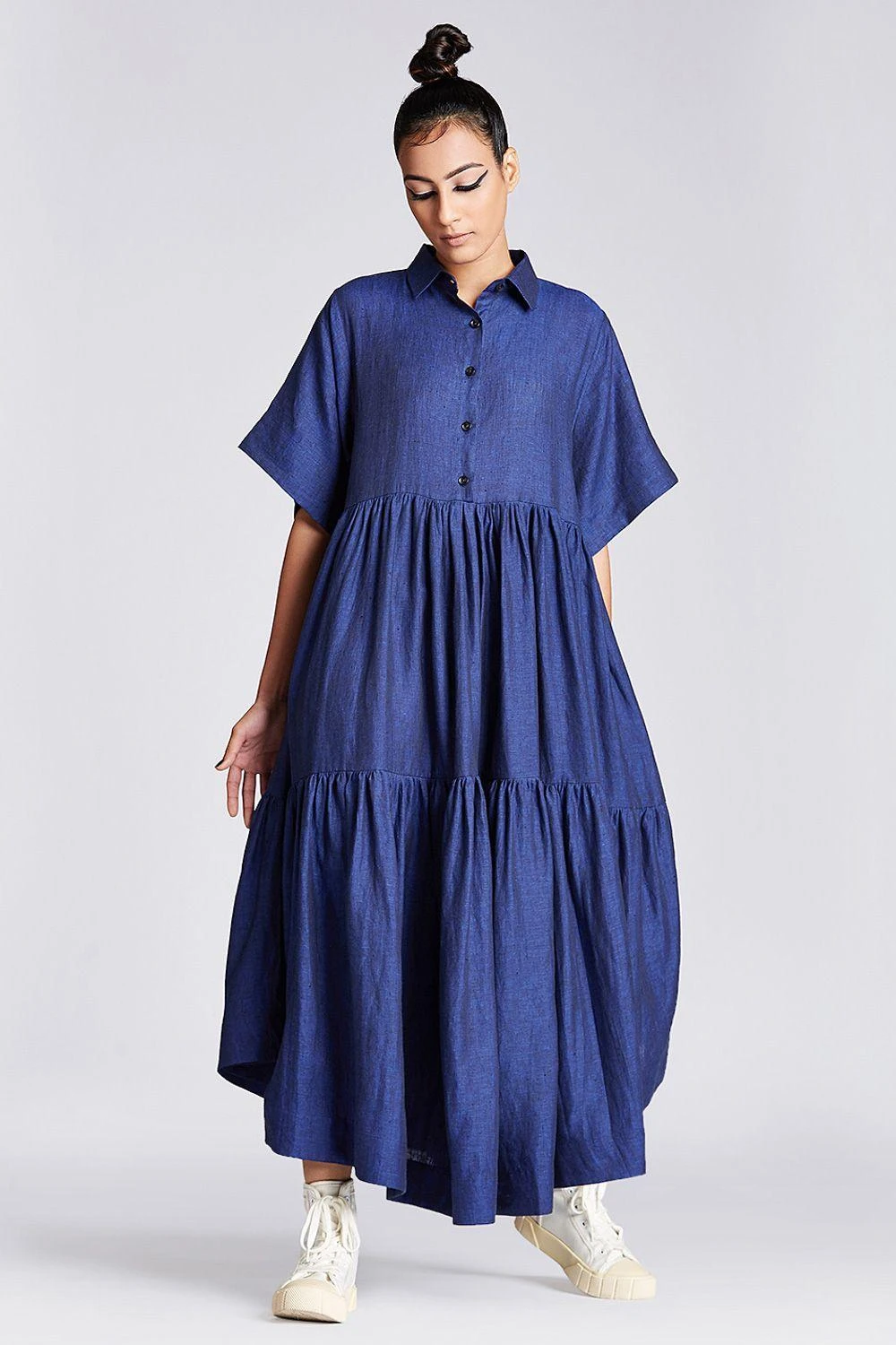 Fuss-free & breezy, this navy tiered dress is a staple worthy piece. It is cut in linen fabric with half button down placket & box sleeves. Style it up with gold hoops for a day out.