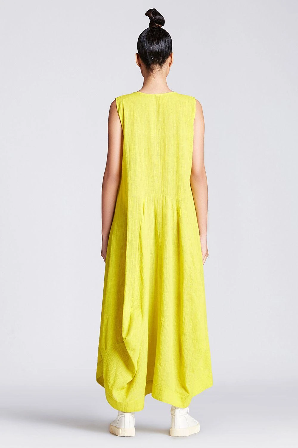 Simple & subtle, this yellow sleeveless dress will work as a great closet cleanser. It is cut in kala cotton with a round neckline & cowl drape details. You can accentuate your look with a statement belt.