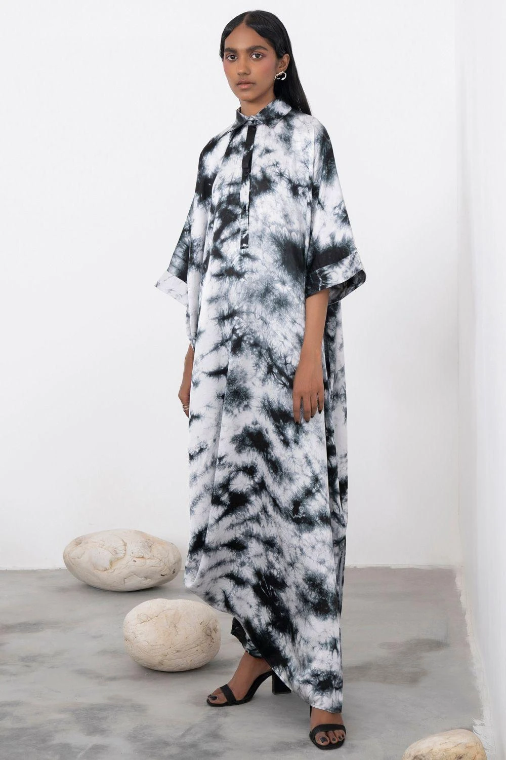 This black & white dress is a trans-seasonal wardrobe piece. It is cut in luscious satin in a relaxed boxy fit with a front button closure & hand dyed effect all over. You can elevate your look with a pair of statement earrings.