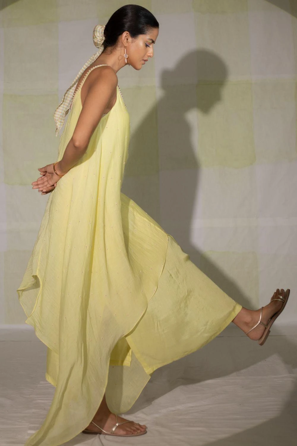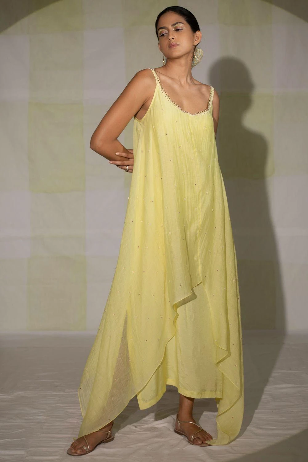 This lemon yellow asymmetric slip dress ensures you a comfortable & breezy fit on your balmy days. It is cut in chanderi and features all over moti booti hand embroidery. You can layer it with a denim jacket for a chic look.