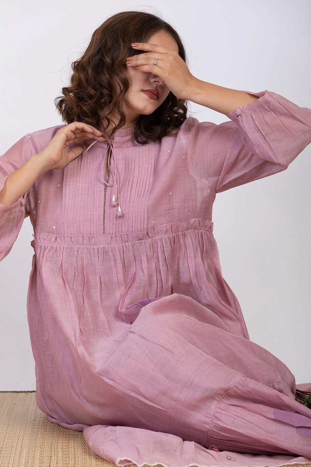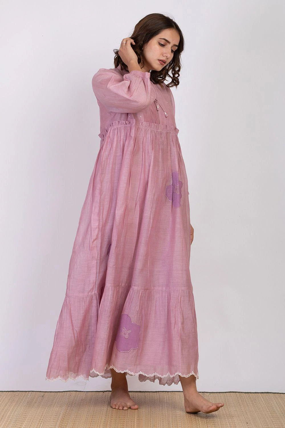 Maximise the life of your wardrobe with this roomy dress. Crafted in soft chanderi silk, it features dainty floral embroidery pleats & scalloped hem. It is paired with a cotton silk slip. Style this set with oxidised jewellery to complete the look.