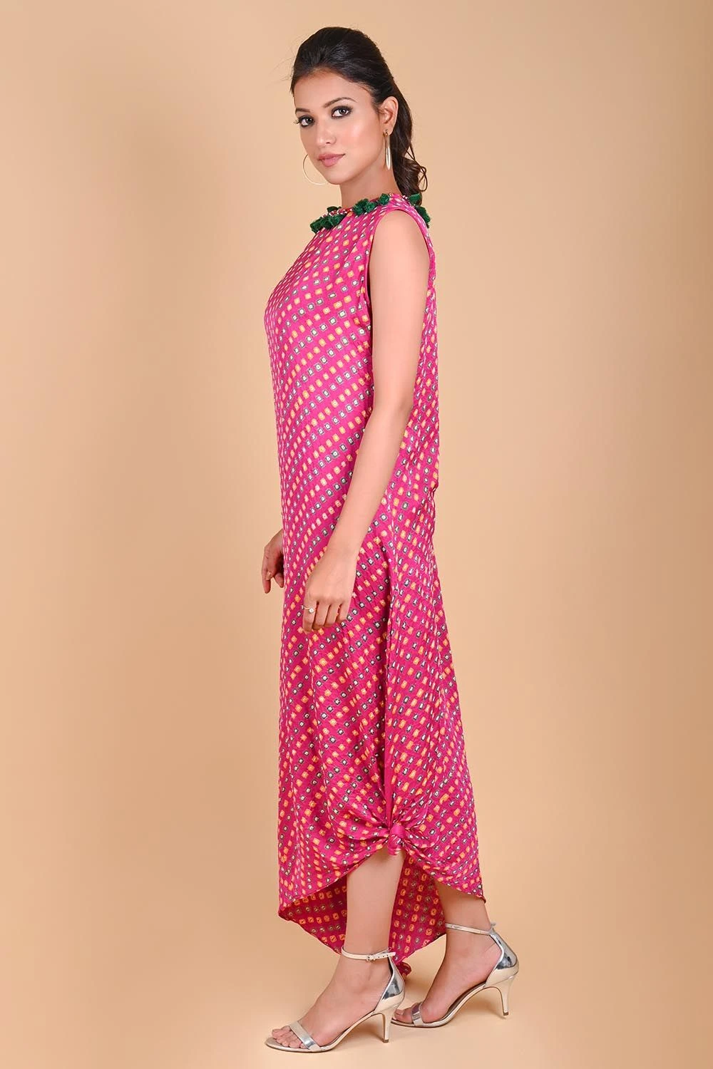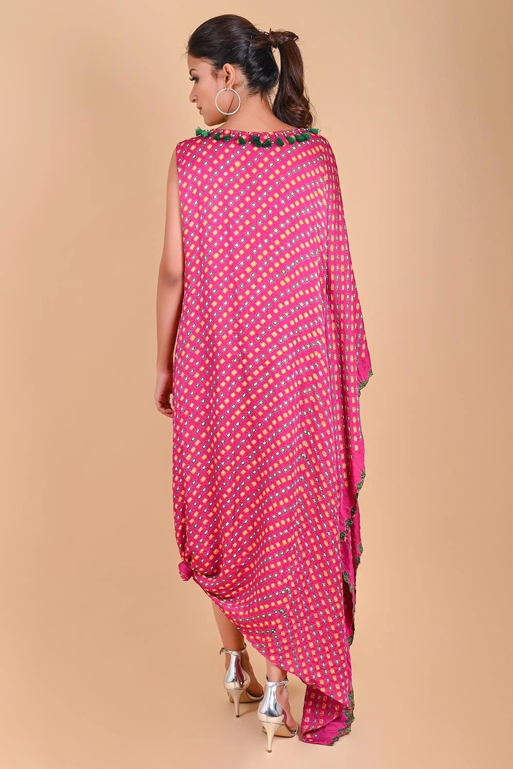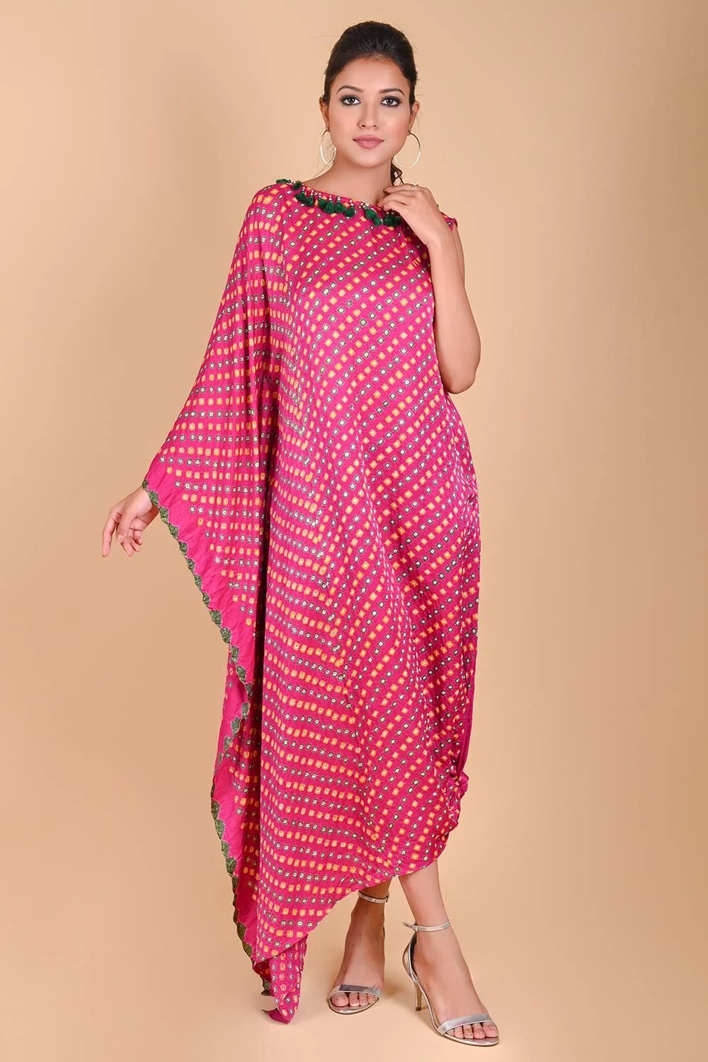 Fuchsia Pink One Shoulder Bandhni Kaftan Dress