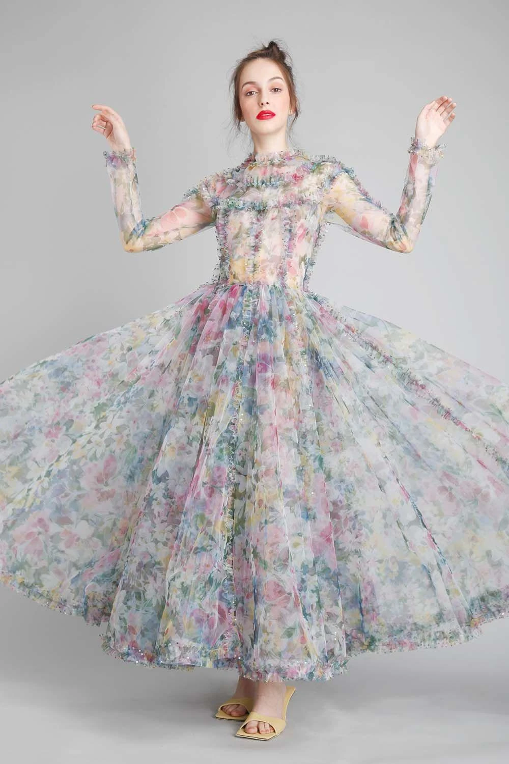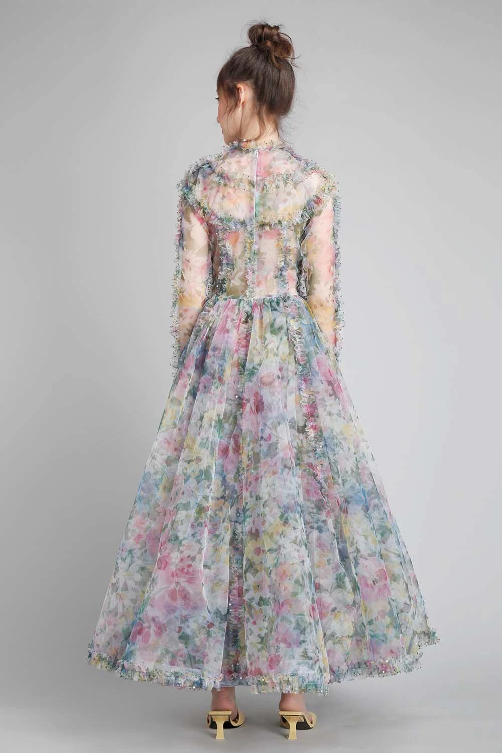 Gauri and Nainika transport you to the 50s with a modern elan and sheer elegance. Featuring this ethereal round neck yoke accented with dainty ruffles. The skirt features a flared hem adding extra charm.