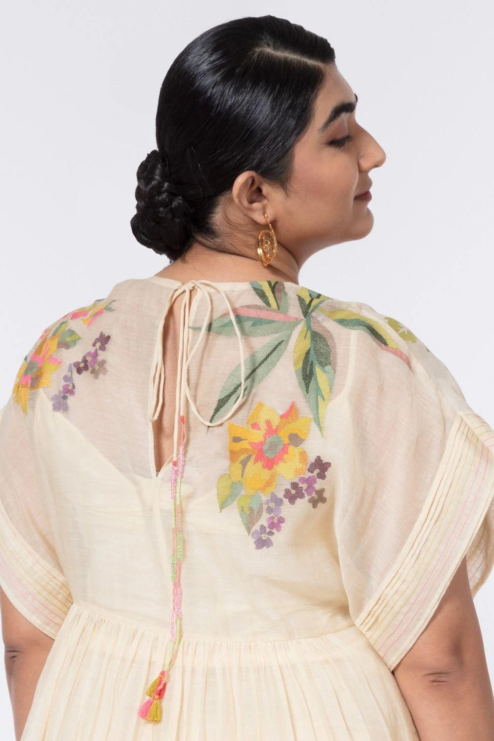 Inspired by a tropical garden, this ivory mini dress is hightlighted with intricate embroidery in bright hues. The flattering silhouette & breezy chanderi fabric make this the perfect look for a summer brunch.
