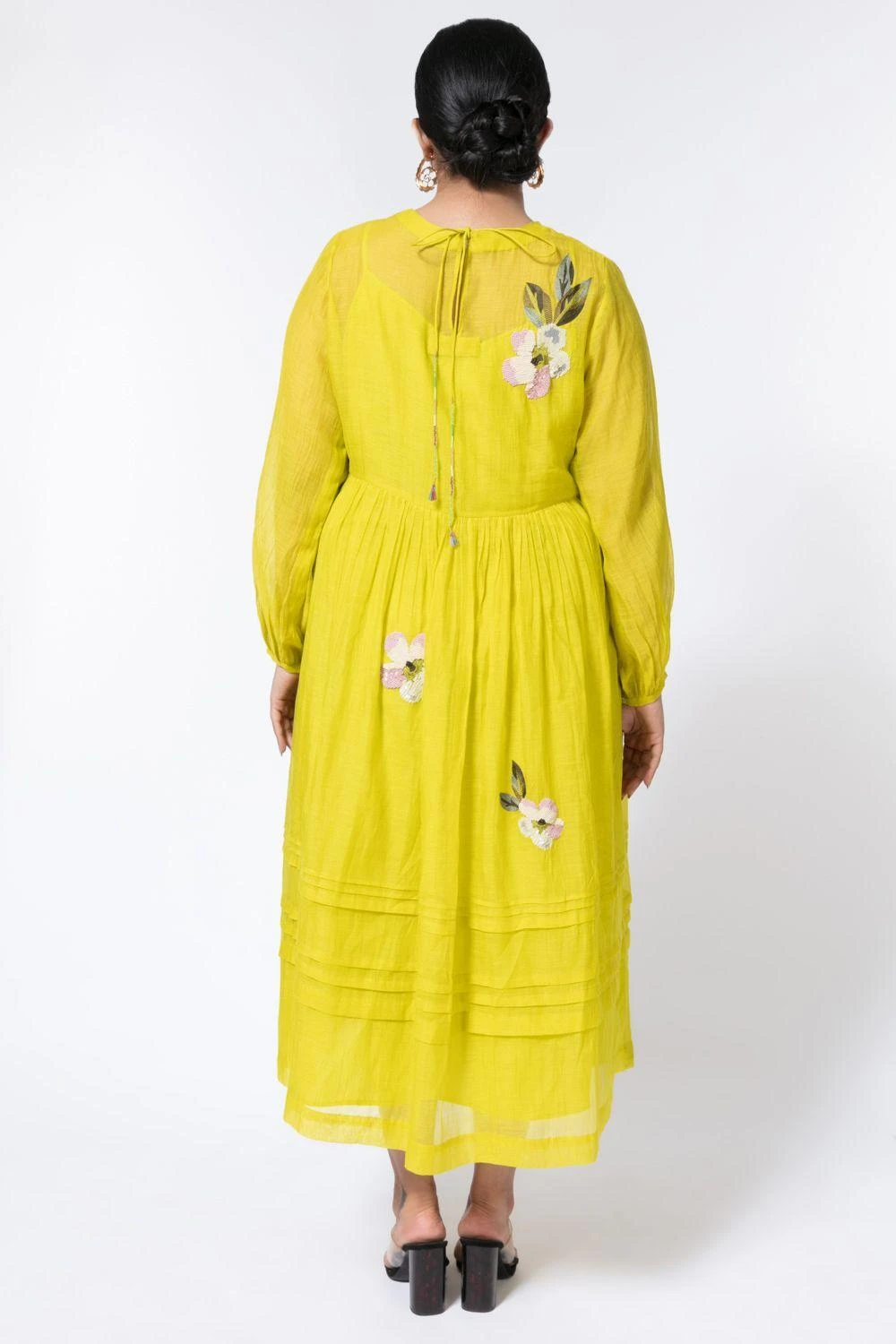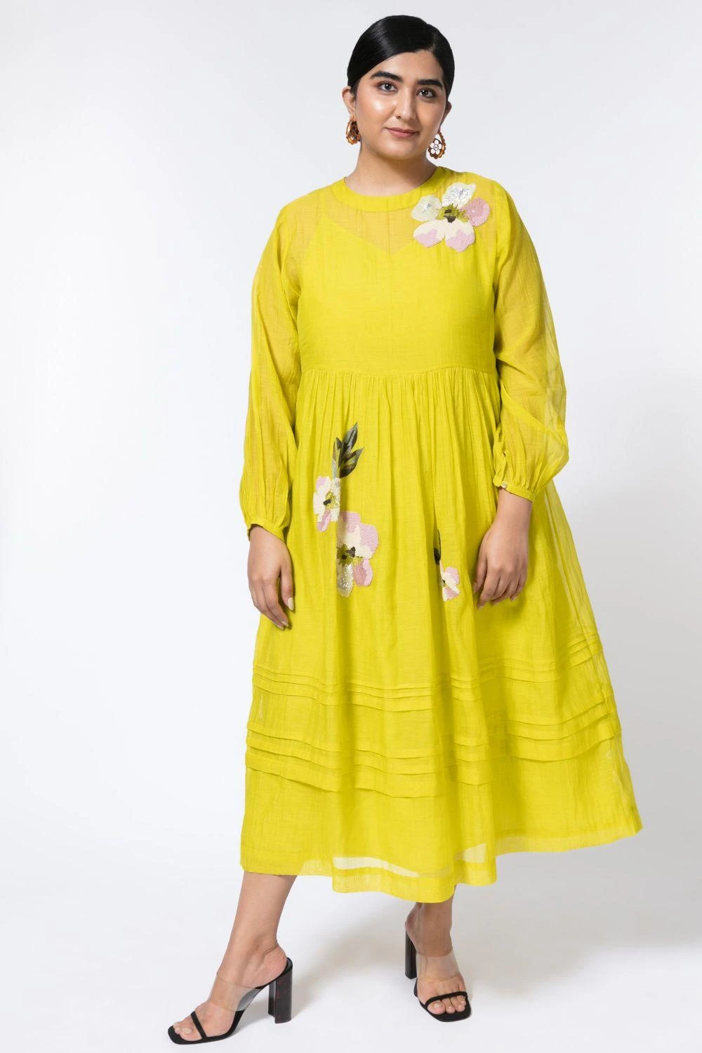 Inspired by a tropical garden this vibrant lime green midi dress is highlighted with floral embroidery invoking a bright & sunny feel. Set in a fine chanderi fabric this piece is perfect for a daytime look.