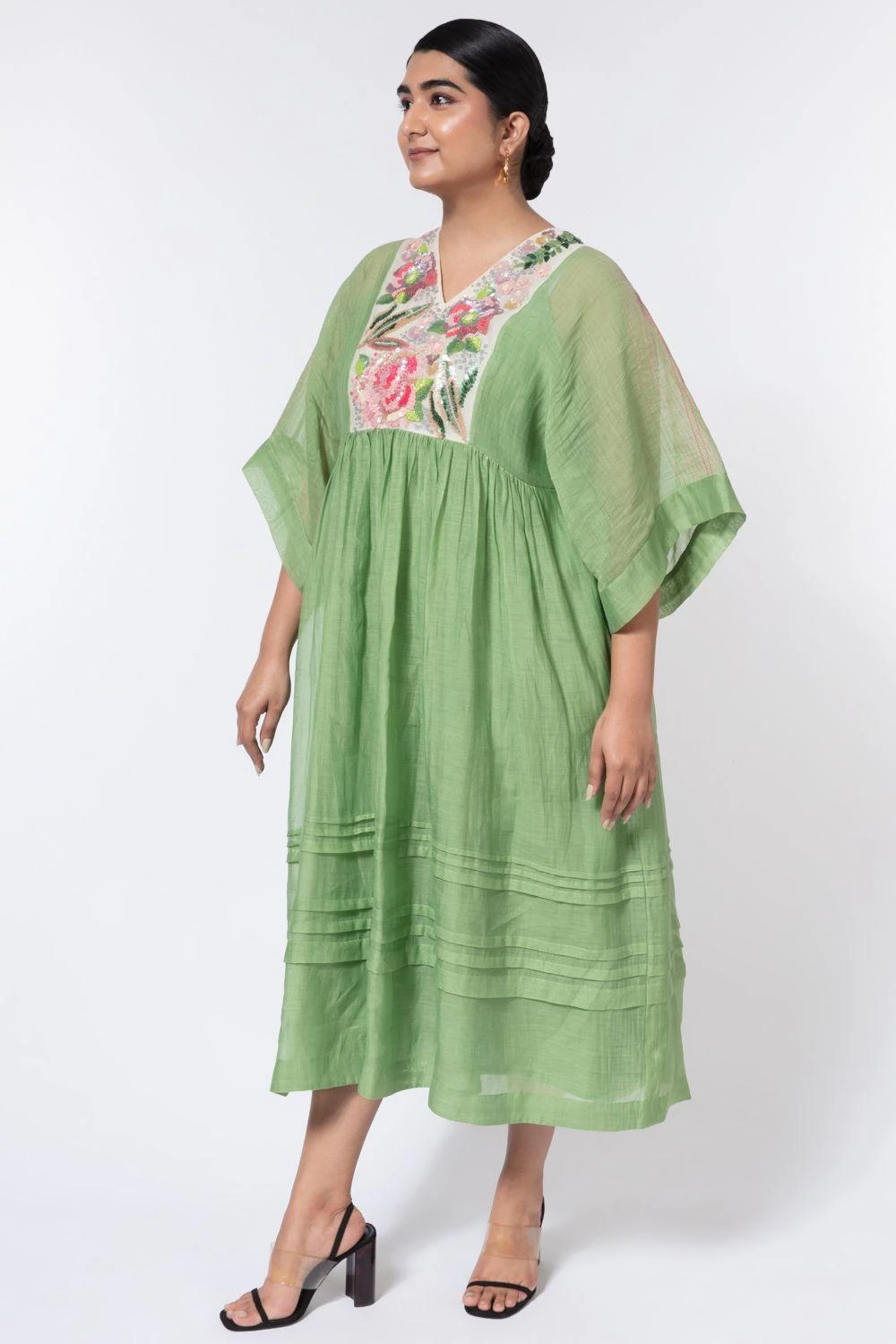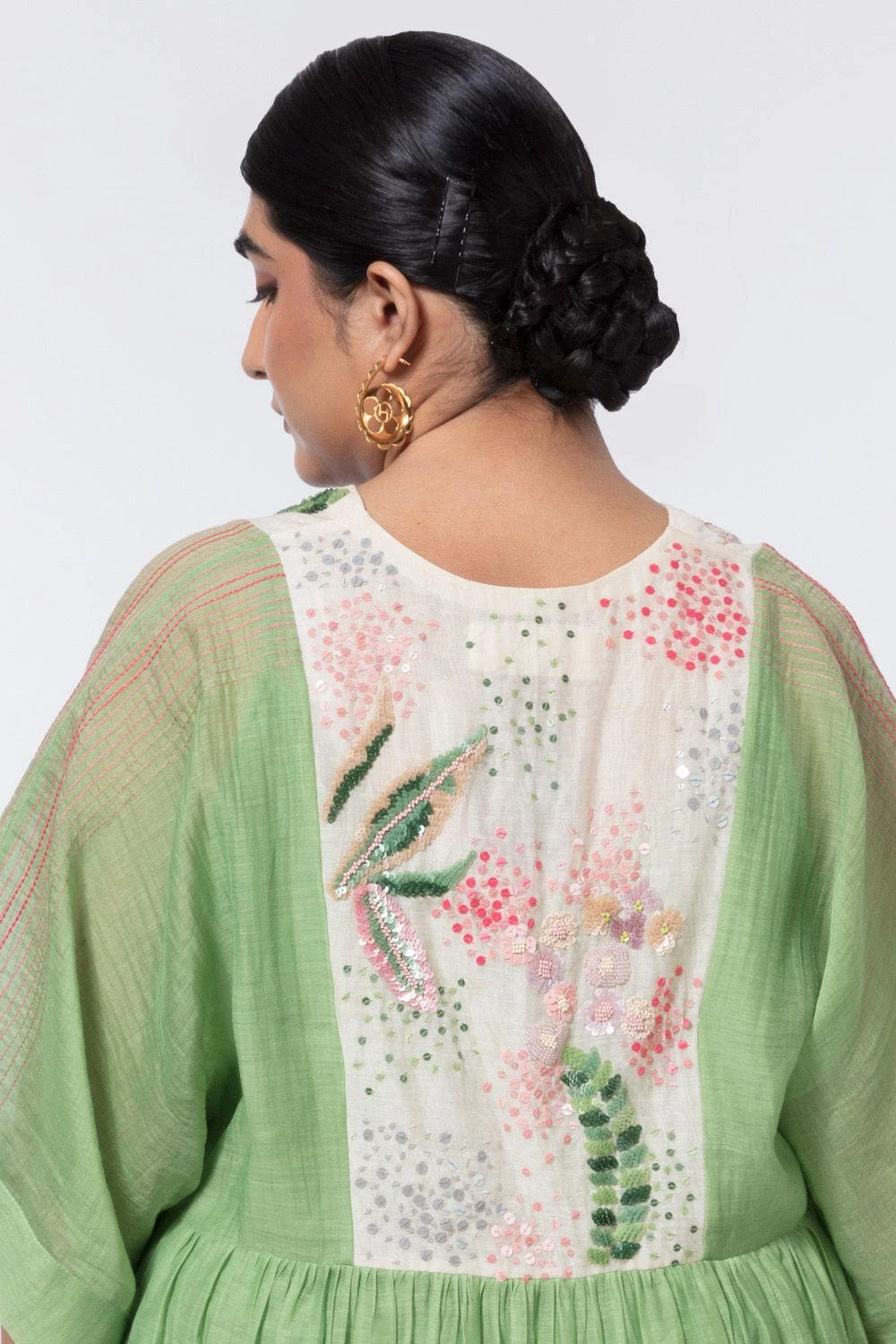 Inspired by a tropical garden, this summery green dress is hightlighted with intricate embroidery in bright hues. The flattering silhouette & breezy chanderi fabric make this the perfect look for a summer brunch.