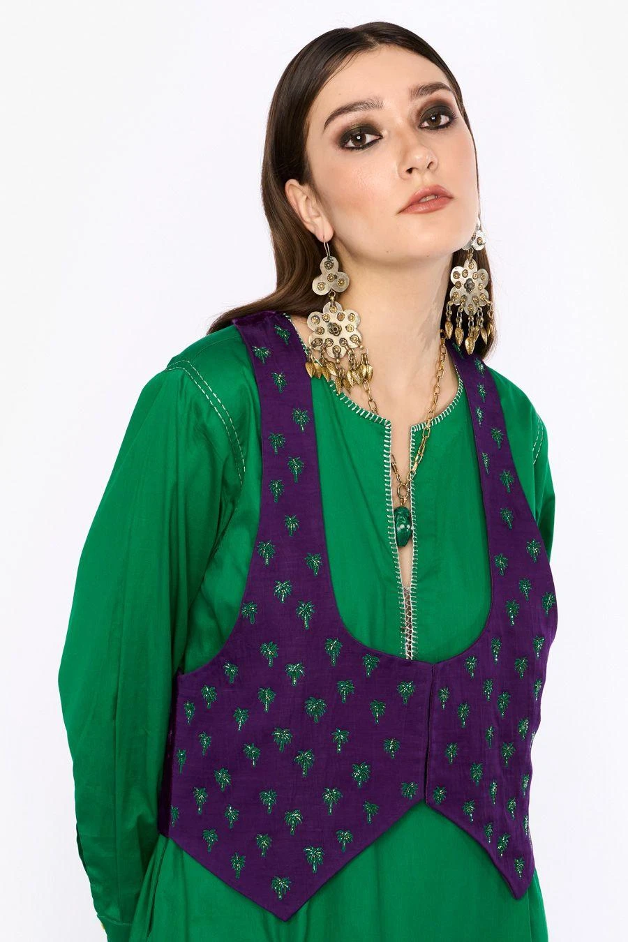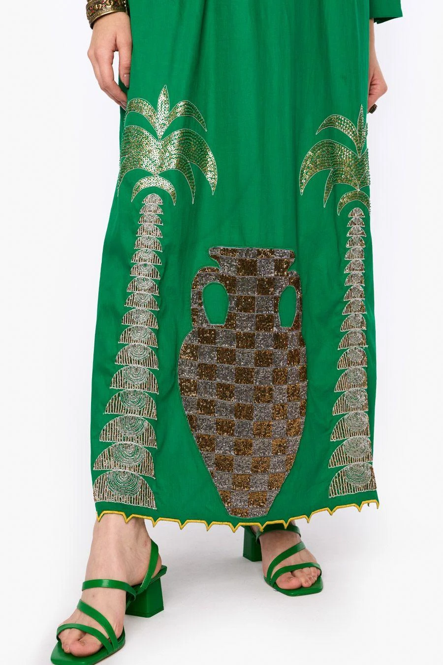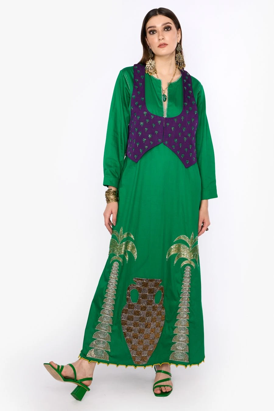 Give your party outfit a fashionable spin with this aari & dabka work column dress. Crafted in cotton satin, this dress features hand embroidered palm tree motifs. Add a pair of statement earrings to complete the look.