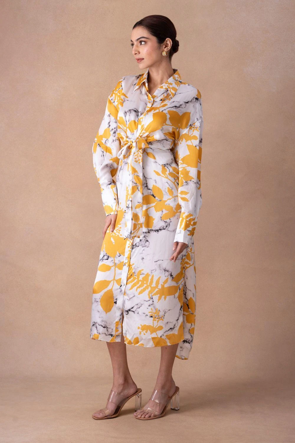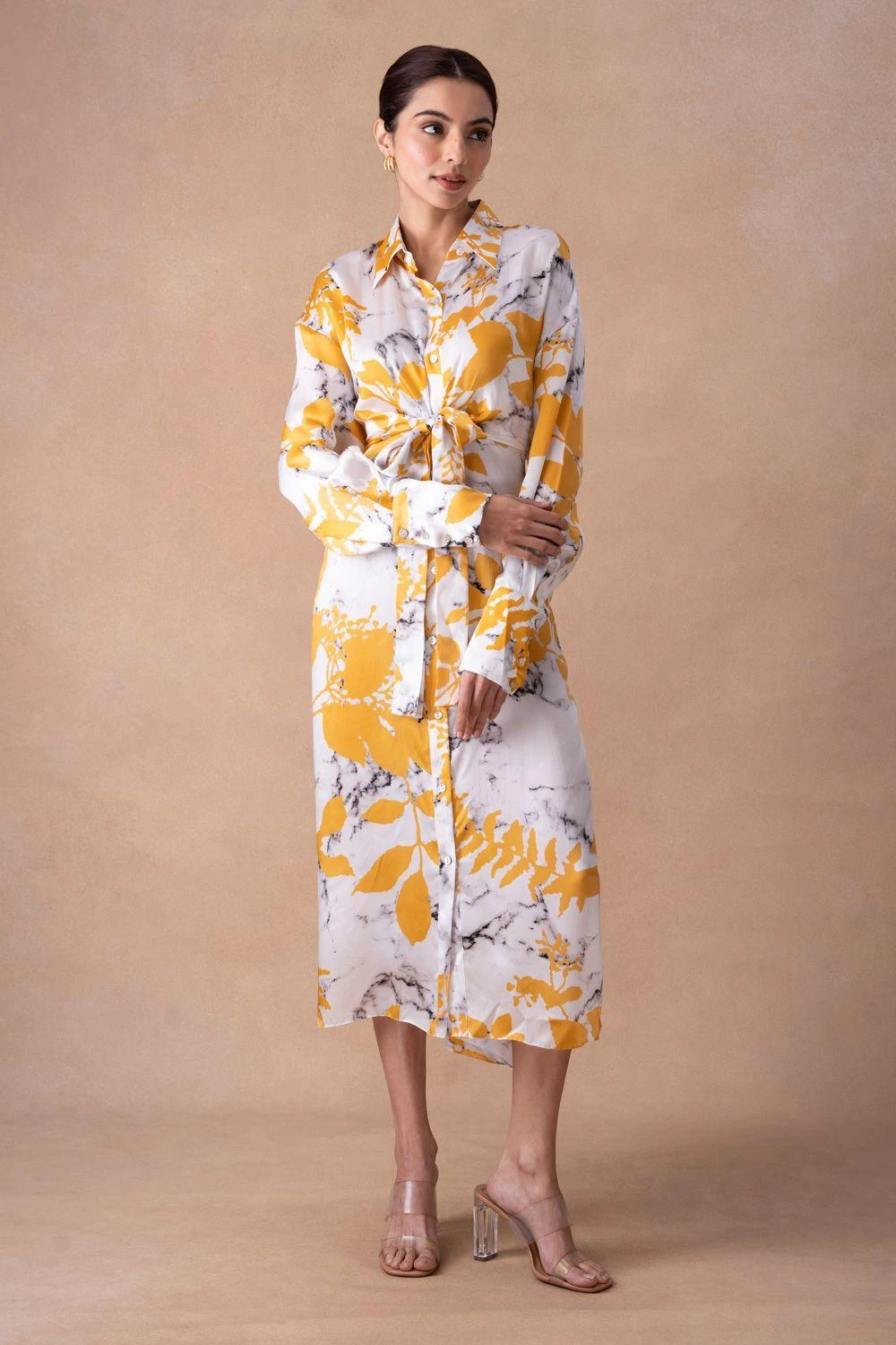 Step into a tale of luxury with the White Marble & Gulmohar Print Shirt Dress, a bemberg satin masterpiece. Front tie-up details add an enchanting touch, weaving a narrative of timeless elegance for the discerning wearer.