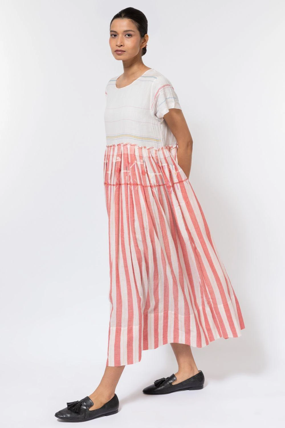 This summery white & red striped midi dress is perfect for casual daytime activities. It is cut in 50% silk & 50% cotton with jamdani details. You can add a linen scarf to this look.