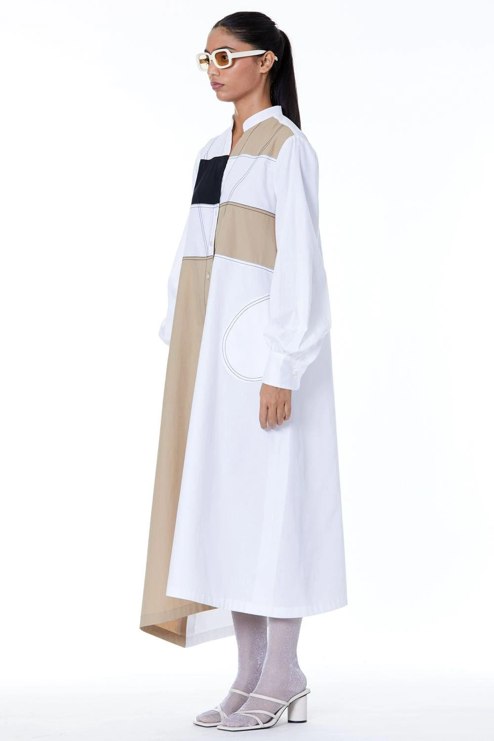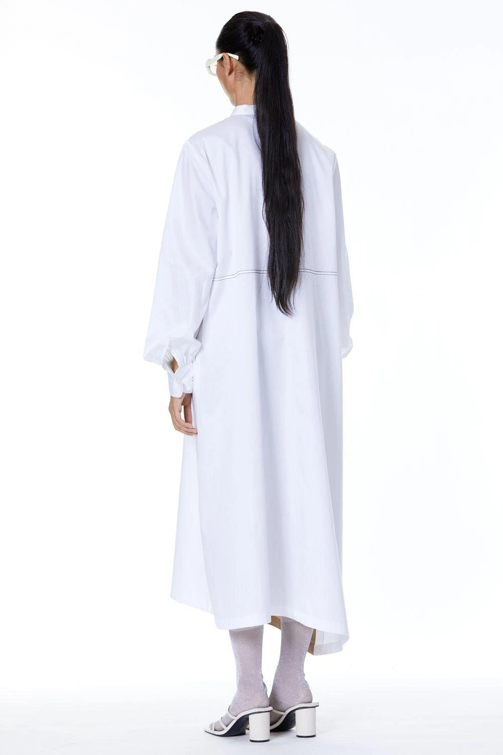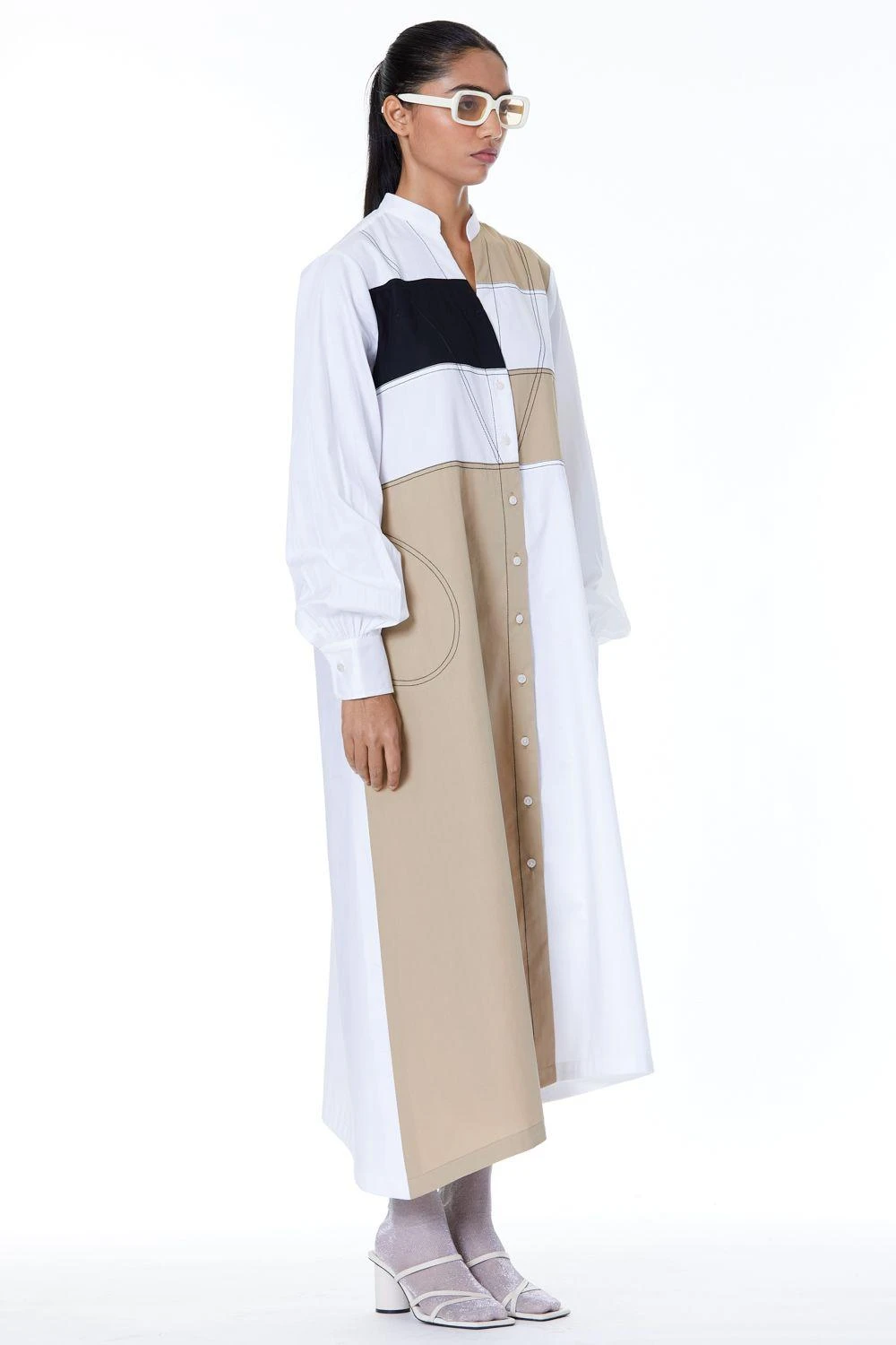The sophisticated colour-blocking of this maxi dress makes it suitable for anything, be it working from home, a picnic in the park, or dinner with friends. This buttoned dress features a mandarin collar, gathered sleeves and topstitched detailing.