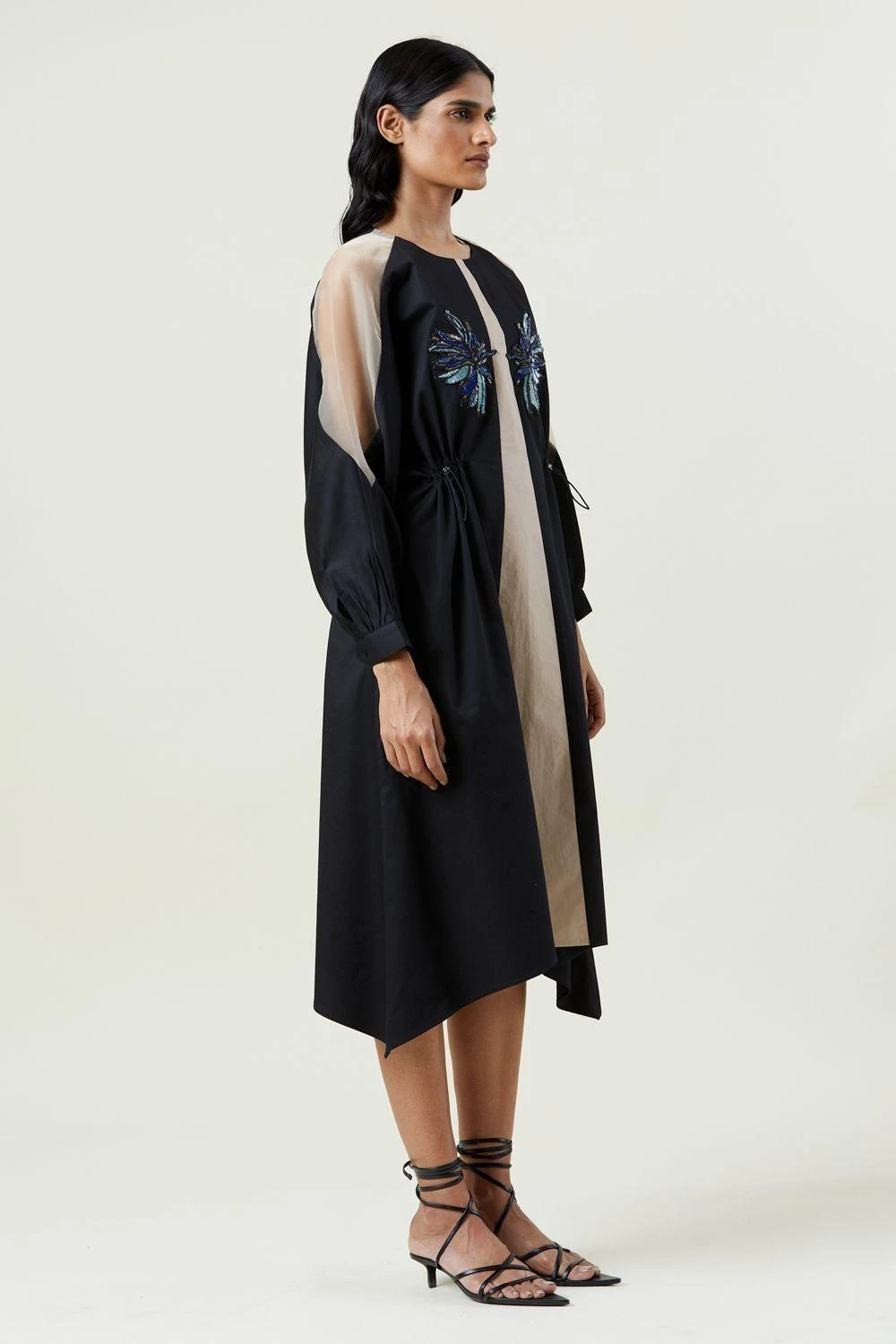 Elevate your wardrobe with this two-toned hand-embellished dress, featuring a cinched waist for a silhouette that effortlessly blends sophistication and flair.
