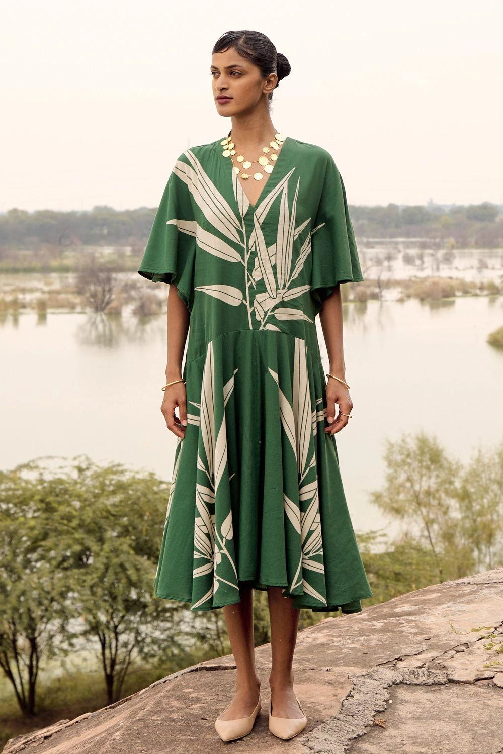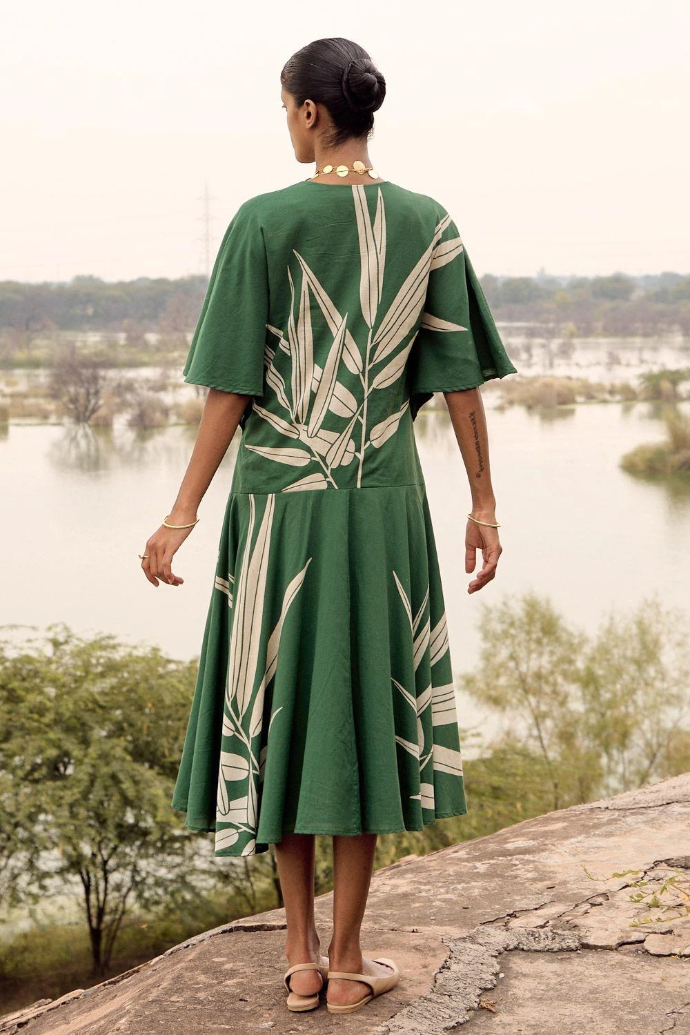The perfect amalgamation of style & comfort, this cadmium green lino print dress is perfect for a day out. A graceful choice that seamlessly combines comfort with style for any occasion.