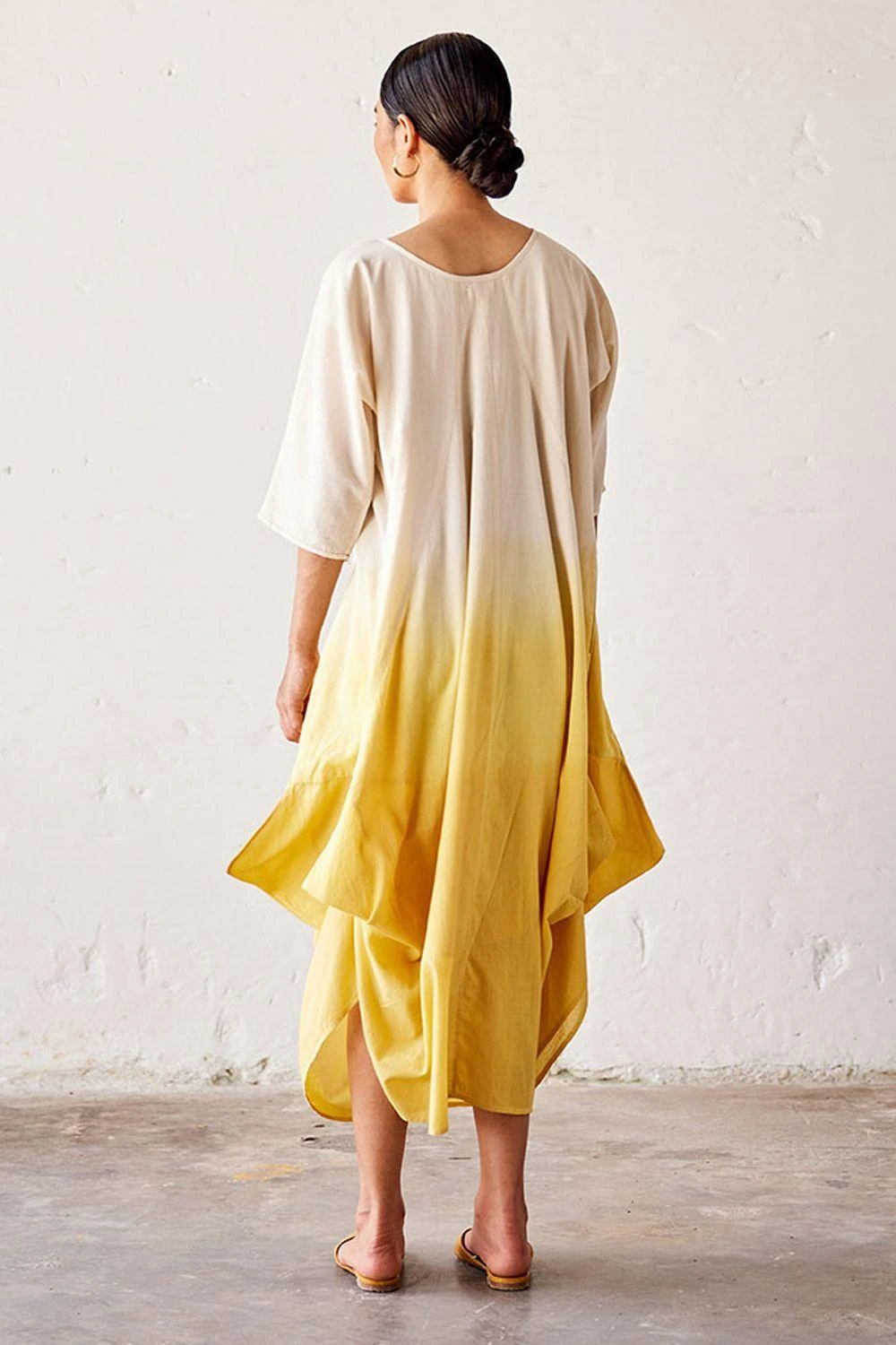 Indulge in vibrant elegance with this yellow dip-dyed mul jhabla. Featuring chic 3/4 sleeves, it’s a timeless symbol of refined style. Add a pair of dangler earrings to complete the look.