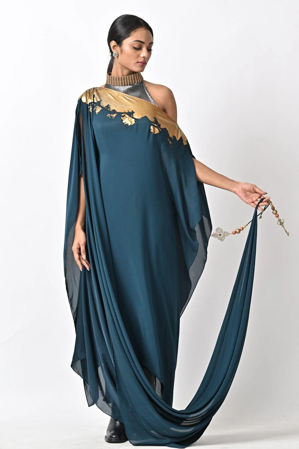 Elevate your style with this mesmerizing draped dress. Featuring intricate foil work and exquisite tassel detailing, this dress is a true embodiment of elegance and grace. The draping adds a touch of fluidity, while the inner lining ensures comfort.