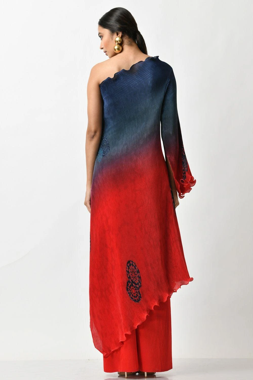 This one sleeved ombre batik printed dress is cut in an inventive micro pleated fabric. This chic piece can be styled as is or with palazzos for a stylish evening look. Accessorise this piece with statement earrings & a choker to complete the look.