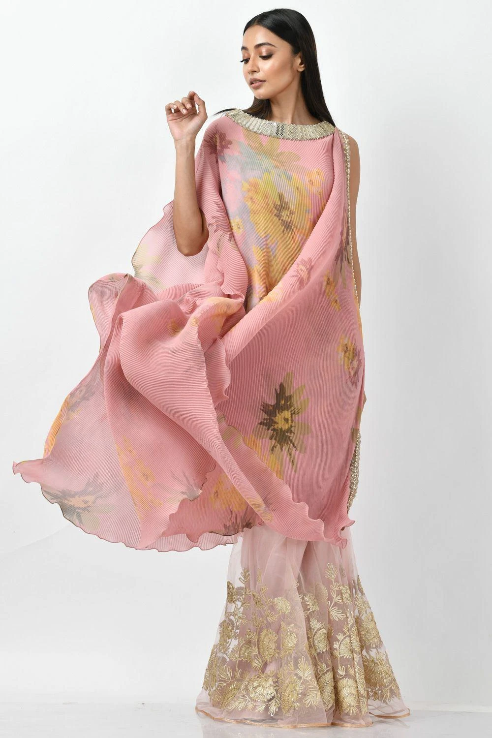 This elegant pink floral printed drape is embellished with tassels & embroidery details. Style this chic set with sharara pants for dressy daytime events.