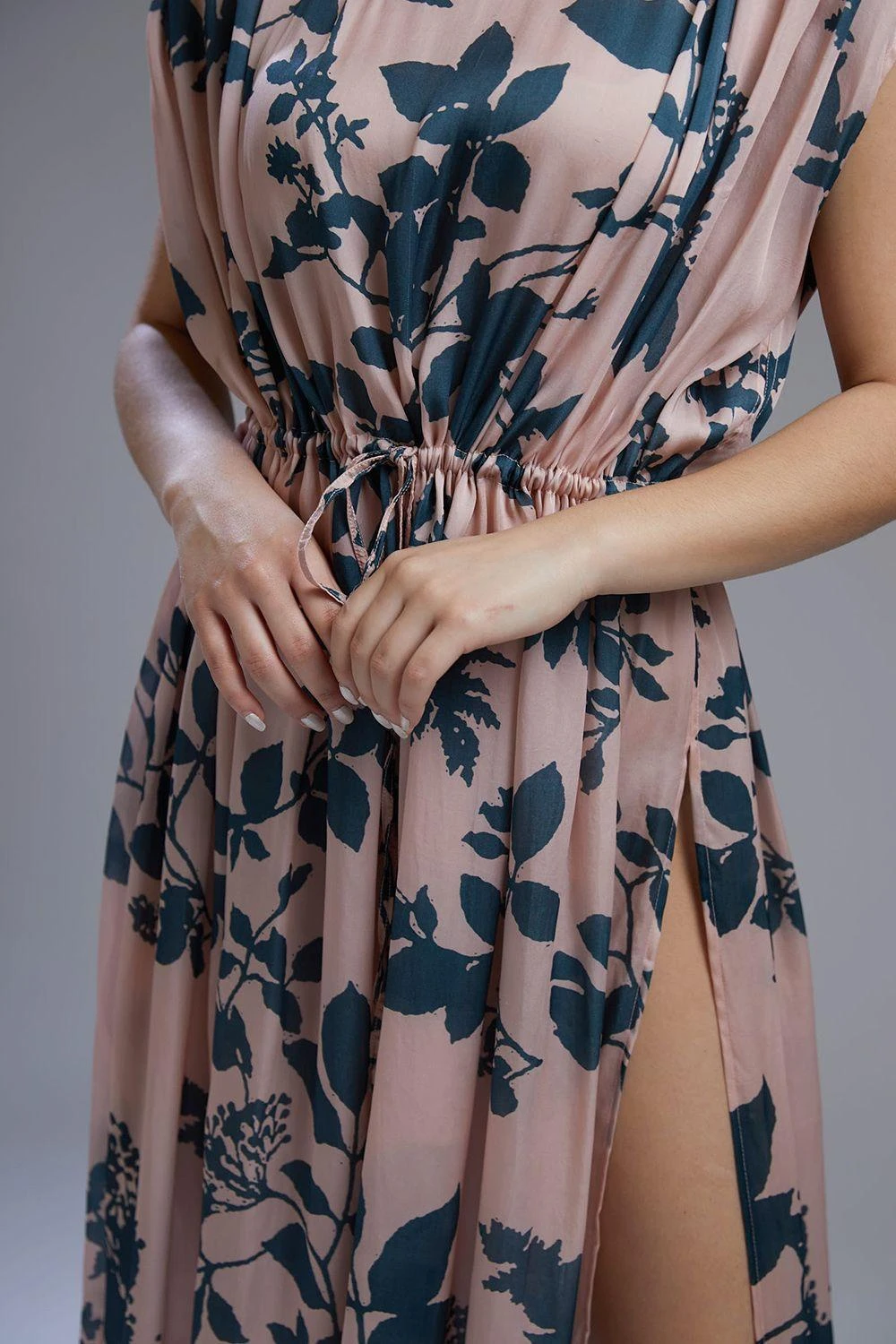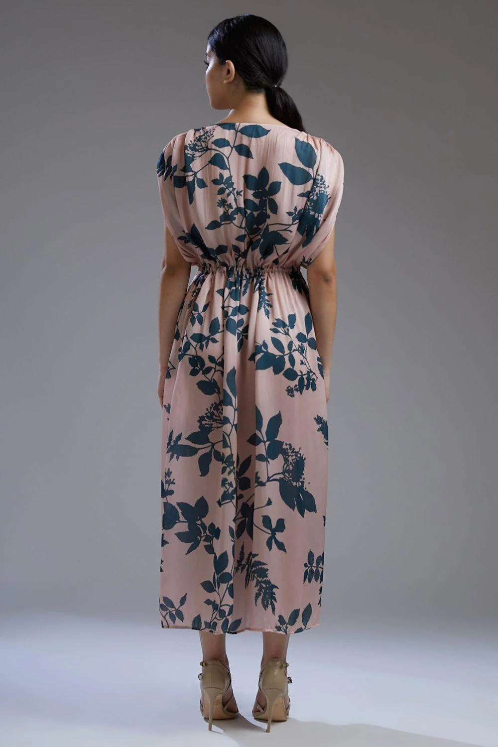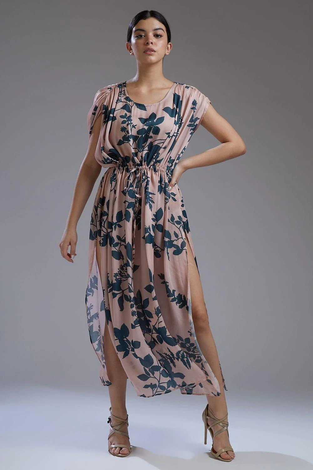 KoAi Satin Silk Peach & Teal Floral Kaftan Dress