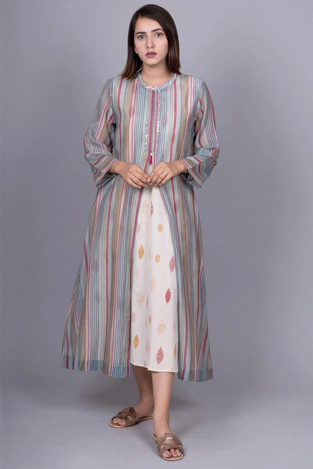 Whether you are lounging at home, vacationing, or dressing for the office, this dress can feel both casual & dressed up. Cut in chanderi, it features a stripe detail. Style it with dainty jewellery to complete the look.