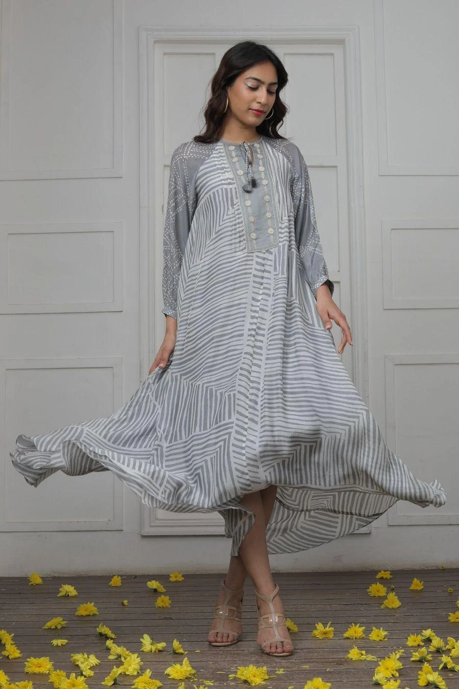 The perfect amalgamation of style and comfort, this dress is perfect for a day out. Crafted in cotton silk, this striped dress features an embellished yoke with raglan sleeves.