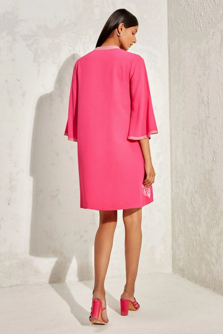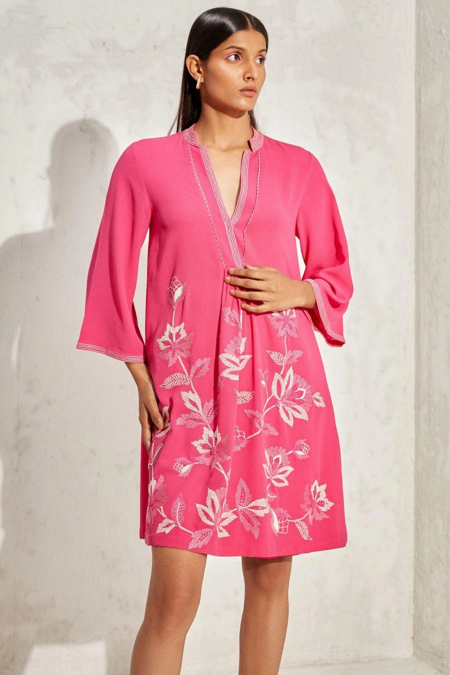 From your work desk to the brunch table & from lounging at home to catching flights, you can always count on this dress. Crafted in textured crepe, this V-neck dress features floral embellished details.