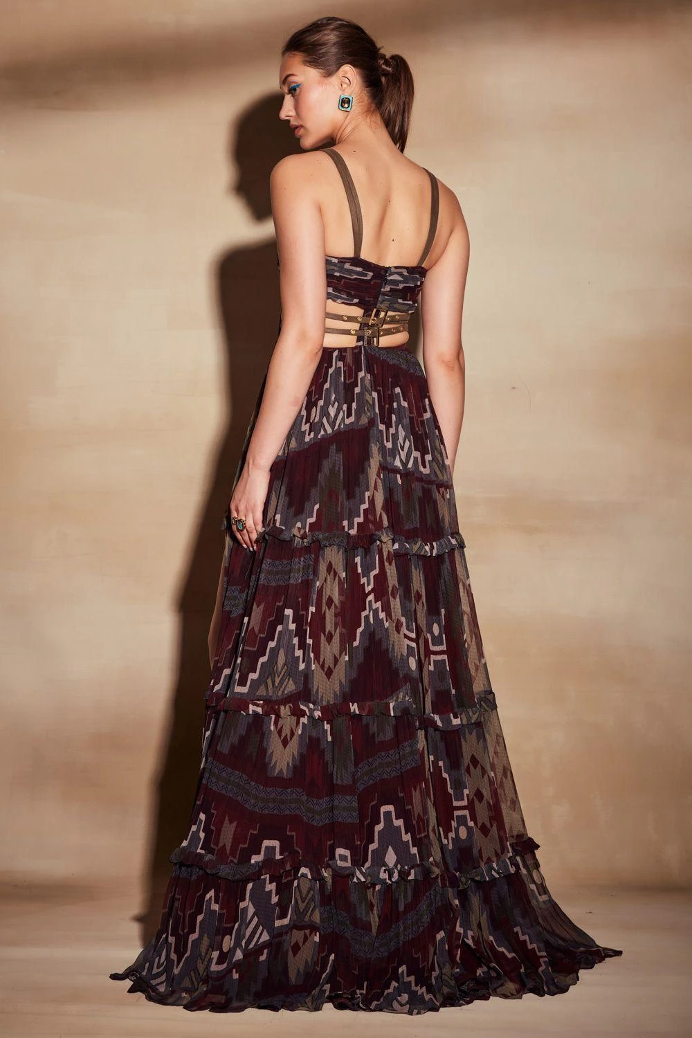 Take the centre stage at your eventful evenings in this glamorous merlot tapis print high-low maxi dress. It is cut in crinkled chiffon fabric with tier details and features cut-out on the waist.