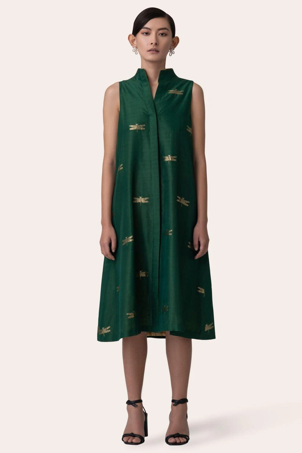 This front open emerald green dress is exquisitely handwoven using the traditional kadua technique in silk, making it a must-have piece. The luscious silk fabric is adorned with dragonfly motifs in gold zari.