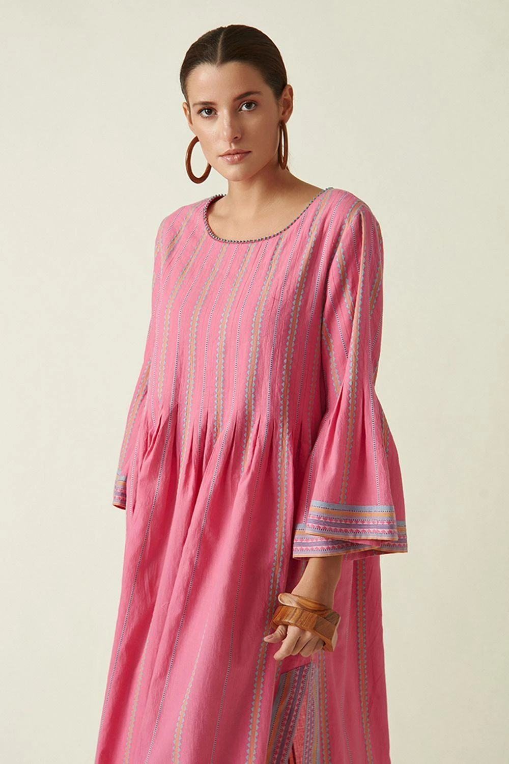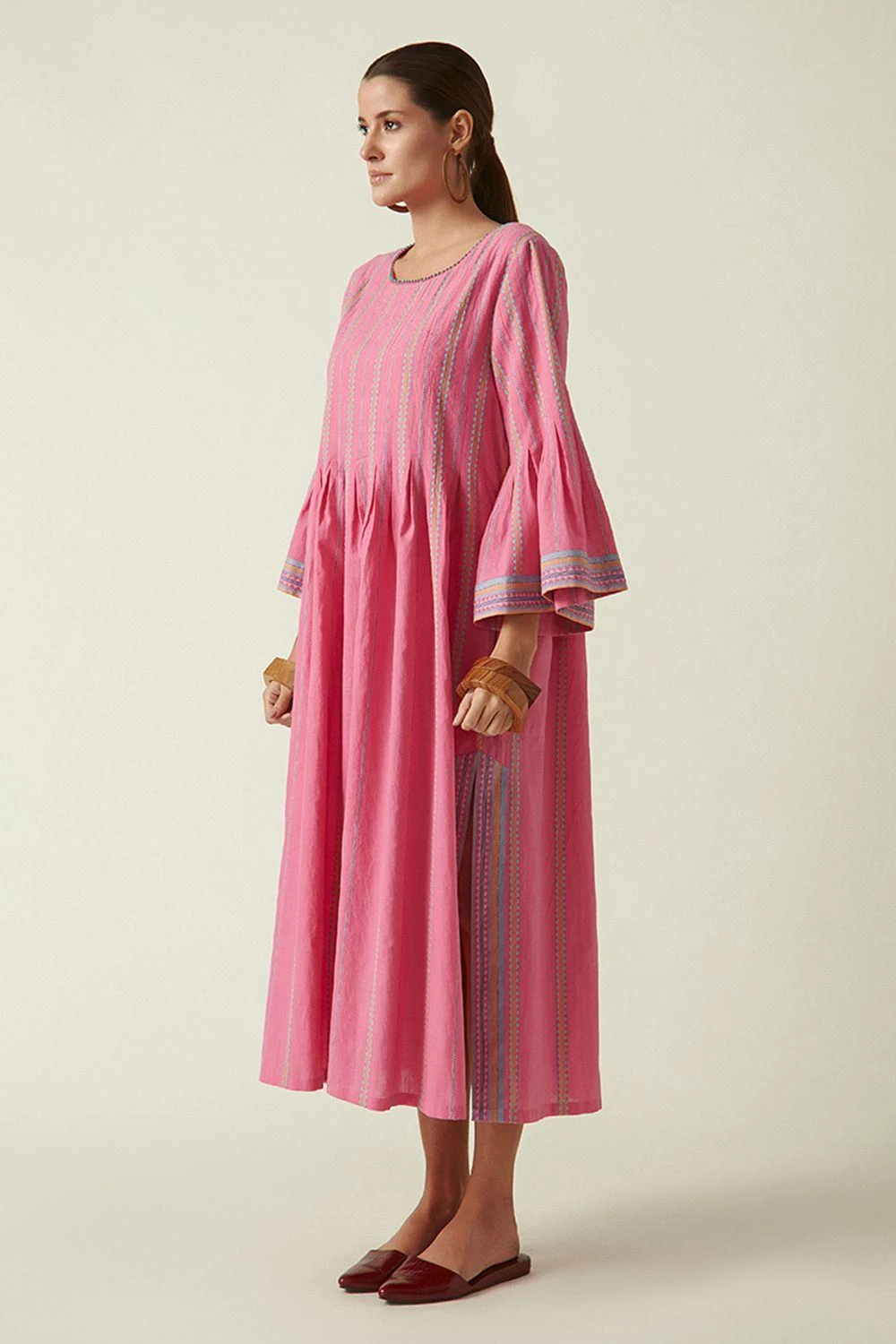 Whether you are lounging at home, vacationing, or dressing for the office, this dress can feel both casual & dressed up. It features a round neck, box pleat, side slits & peplum sleeves. The dobby woven stripes add an interesting contrast to it.