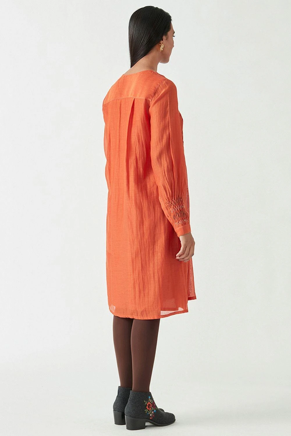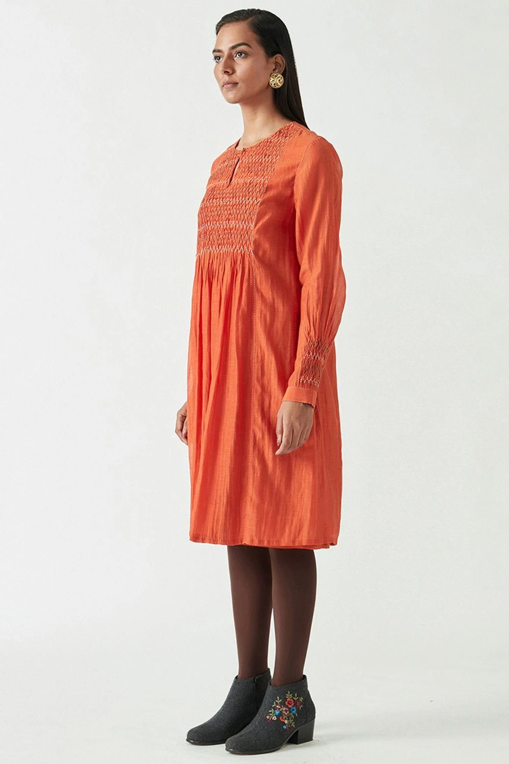 This round neck rust saffron dress is a perfect pick for a fall evening. It is cut in cotton silk and features smocking details in the front. Style this piece with minimal accessories and ankle boots to complete your look.
