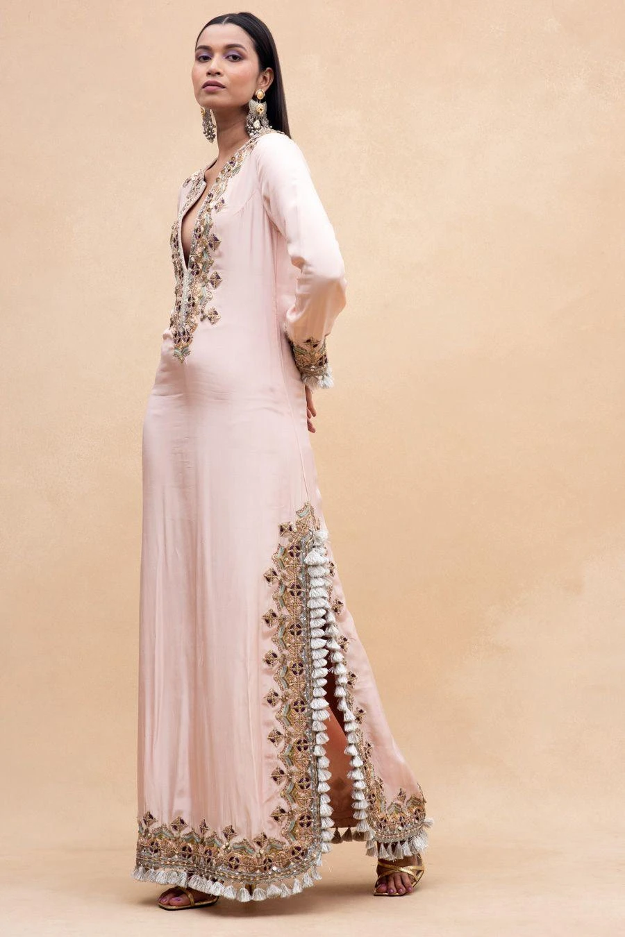 Make a style statement in this boho chic pink kaftan. It is cut in fine georgette and accentuated with exquisite embroidery details & tassels on the sides and cuffs. It can be styled with a pair of studs.
