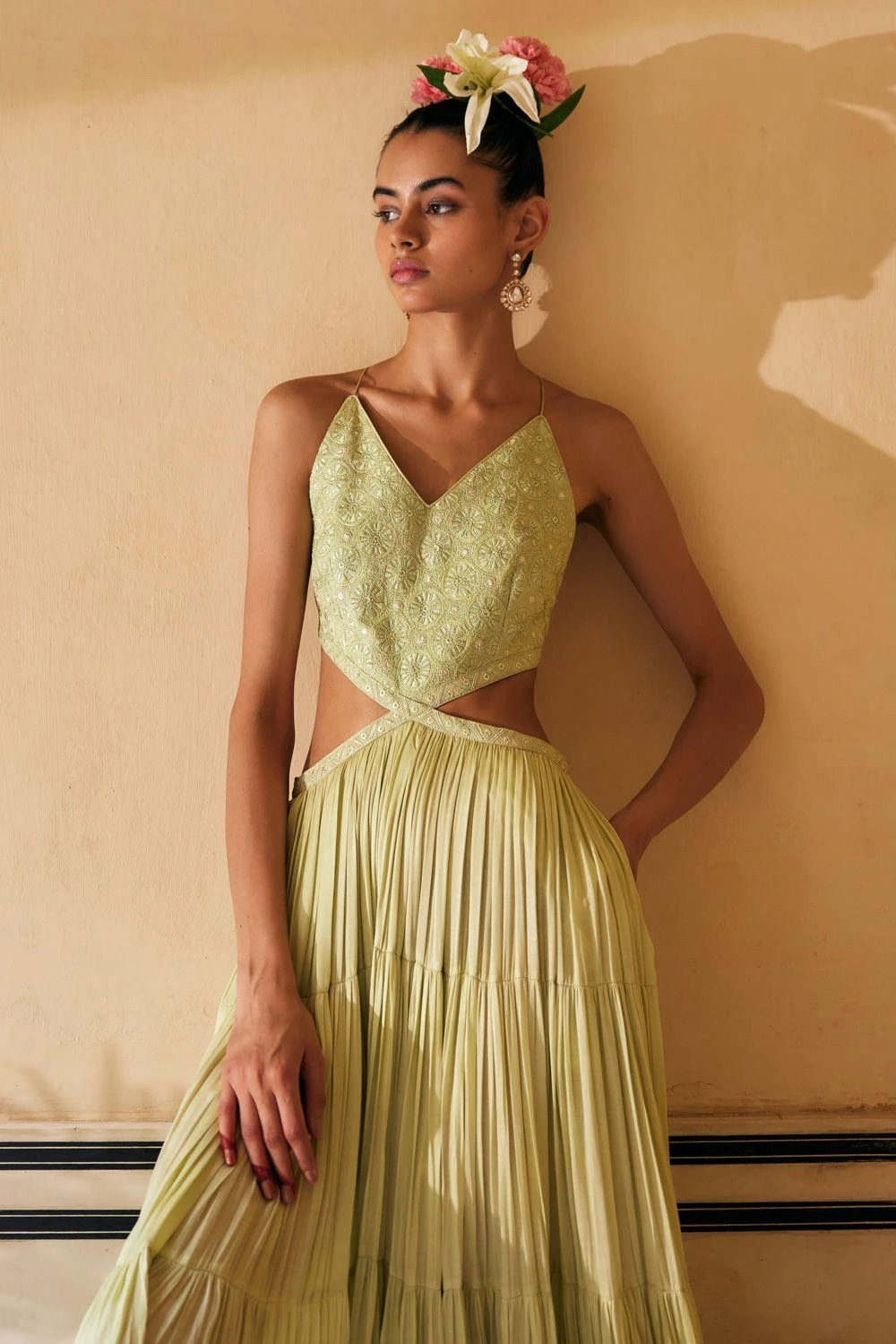 Look effortlessly stylish with this mint green dress. Crafted in satin silk, this tiered dress features a resham and patra embroidered yoke. Add a pair of statement earrings.